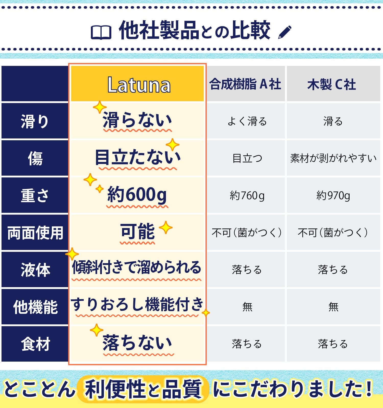?【世界各国の衛生基準突破】有害物質なし!細菌なし!化合物無し!の3拍子。このご時世だから気になる衛生面をとことん追求しました。一般的なまな板は使っていくうちに傷が目立ちそこに菌が入りがち…しかしLatunaのまな板は、表面も傷が付きにくく色が移りにくい素材を採用。万が一の際は、漂白もできるのでいつでも清潔状態を保つことができます。※まな板表面に黒色や黄色が混ざることがありますが、汚れではありません。素材の一部に麦を使用している為品質に問題はなく、安心・安全にご使用いただけます。