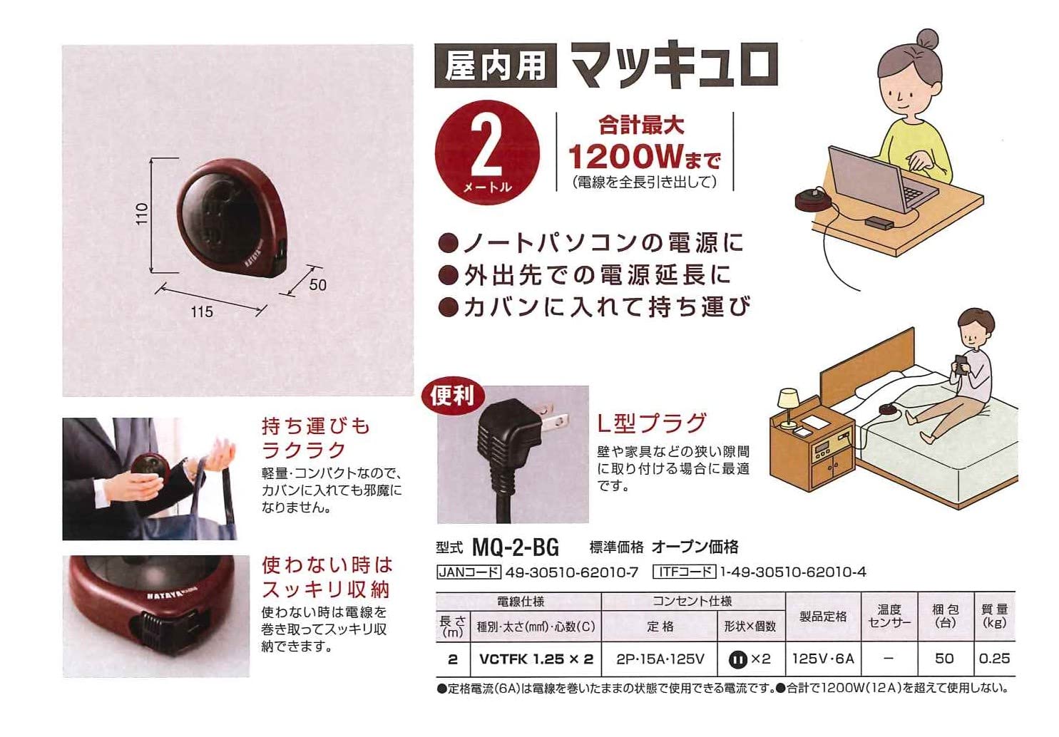 【特徴】ギフトやノベルティにおすすめ。手巻式。ノートパソコンの電源、外出先の電源延長に。軽量・コンパクトでカバンに入れて持ち運びやすく、外出先などでの使用に便利です。また、壁や家具などの狭い隙間に取り付けやすいL型プラグを採用しました。※ホームリールは、コードを全て引き出してご使用ください。