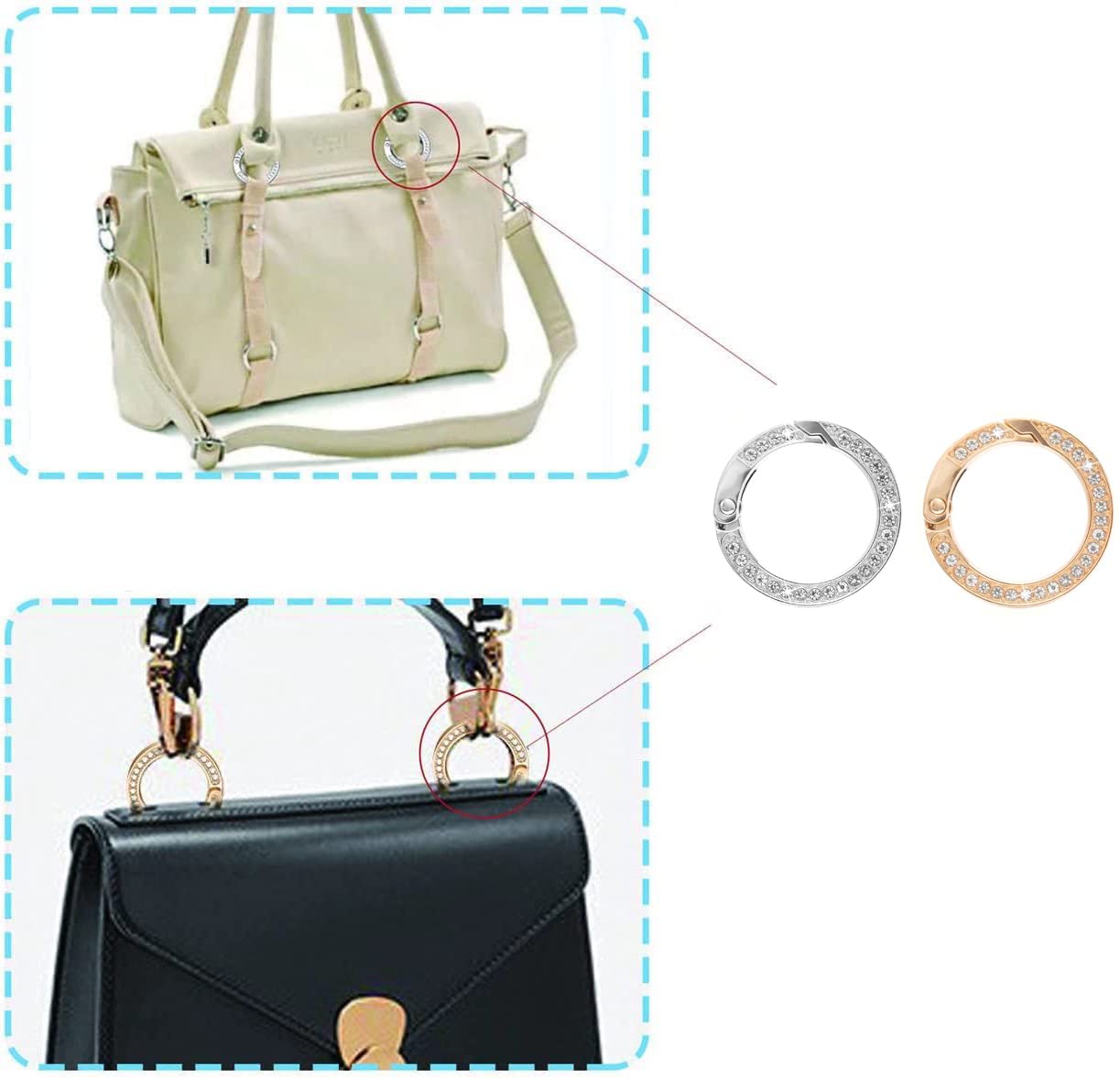 【特価商品】サムコス キーリング おしゃれ カラビナ ラインストーン キラキラ 丸型 カバン飾り 鍵飾り バッグチャーム DIY手作りアクセサリー ジュエリー作り デコキット 人気 レディース 金色+銀色 4個セット