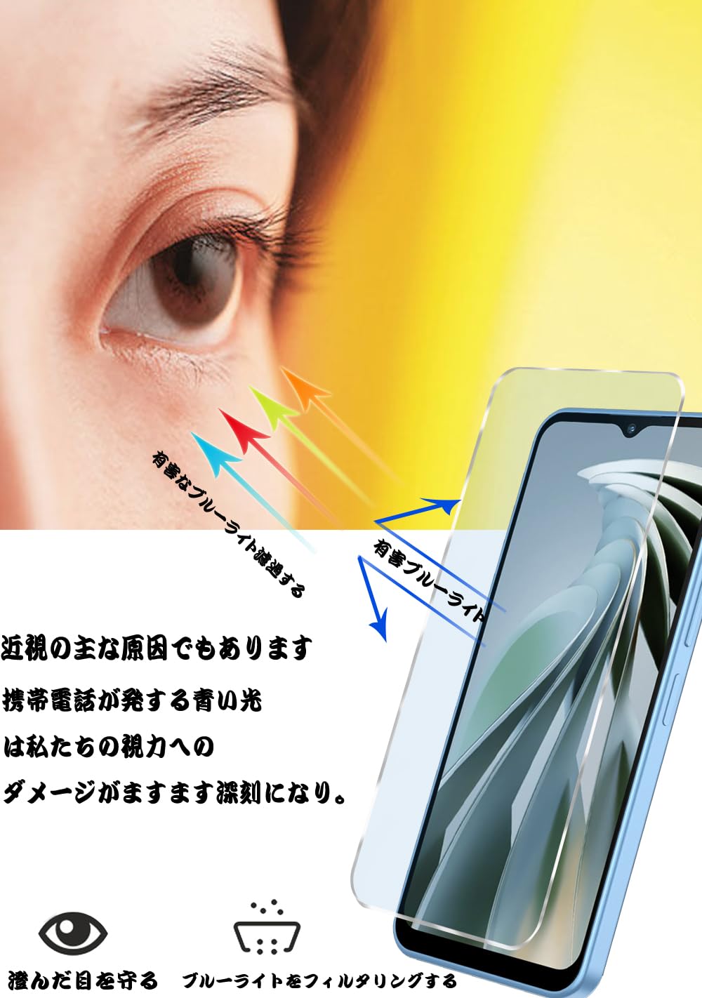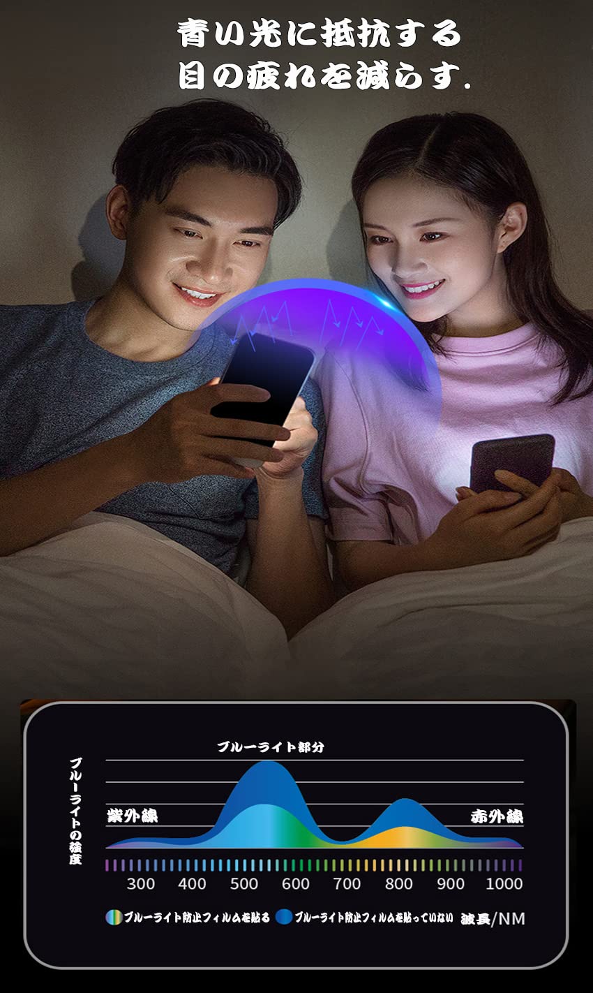?【ブルーライトカット】最新ブルーライトカット反射技術により93%のブルーレイを有効的にフィルタリングでき、目に掛かる負担を軽減し、視力障害を拒否します。長い時間使っても目が疲れません。効果的に近視を予防でき、ディスプレイを長時間眺める方に効果を発揮します。ブルーライトカット商品ですので、特徴な構造で画面は角度によって、淡い黄色、青紫色に見えます。予めにご了承ください。