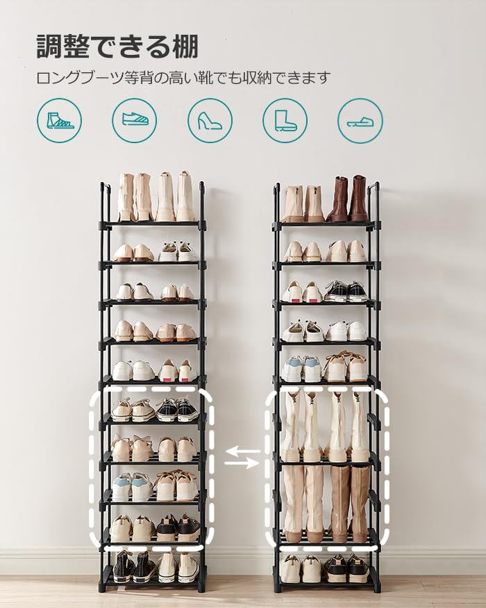 【棚数を自由に調節可能】棚数を減らせばロングブーツも収納可能です。お持ちの靴に合わせて自由にカスタマイズできます