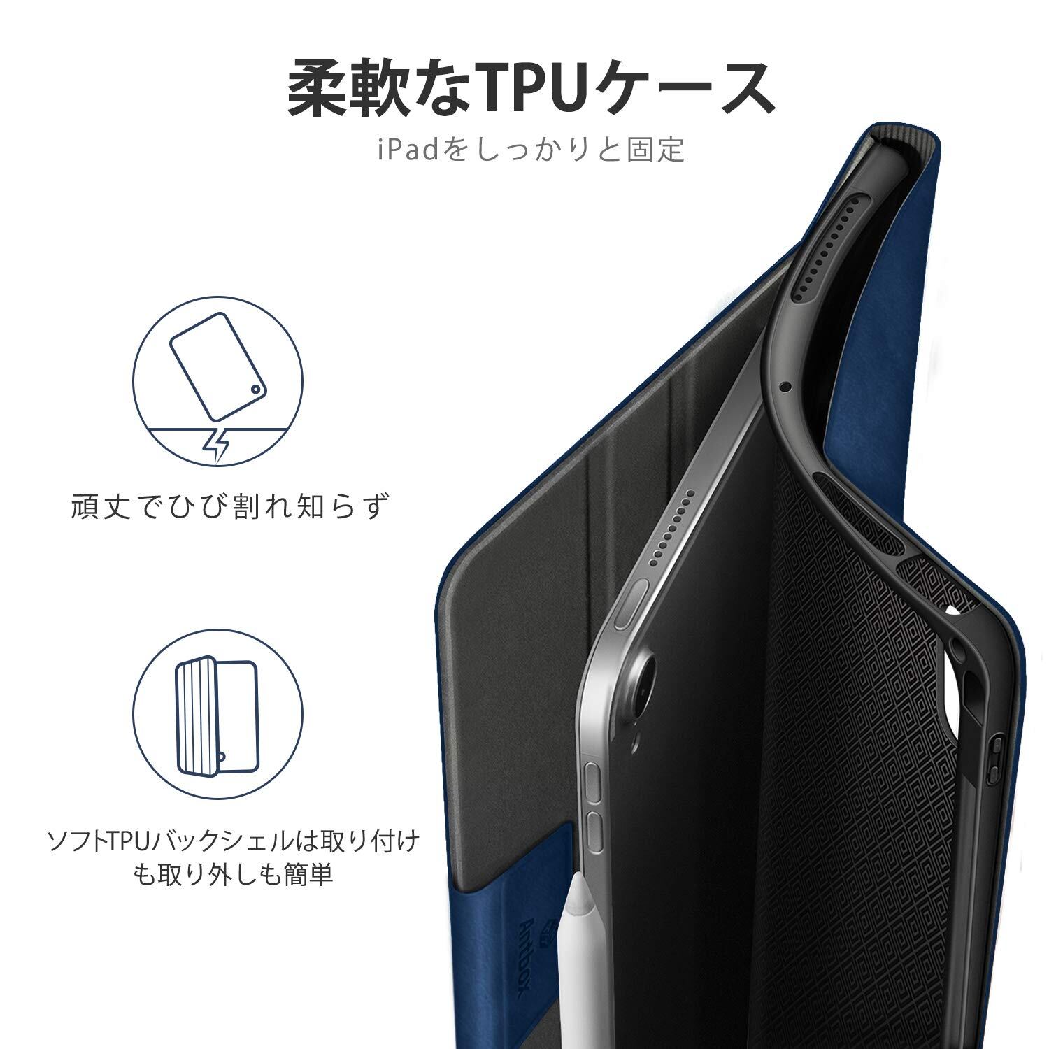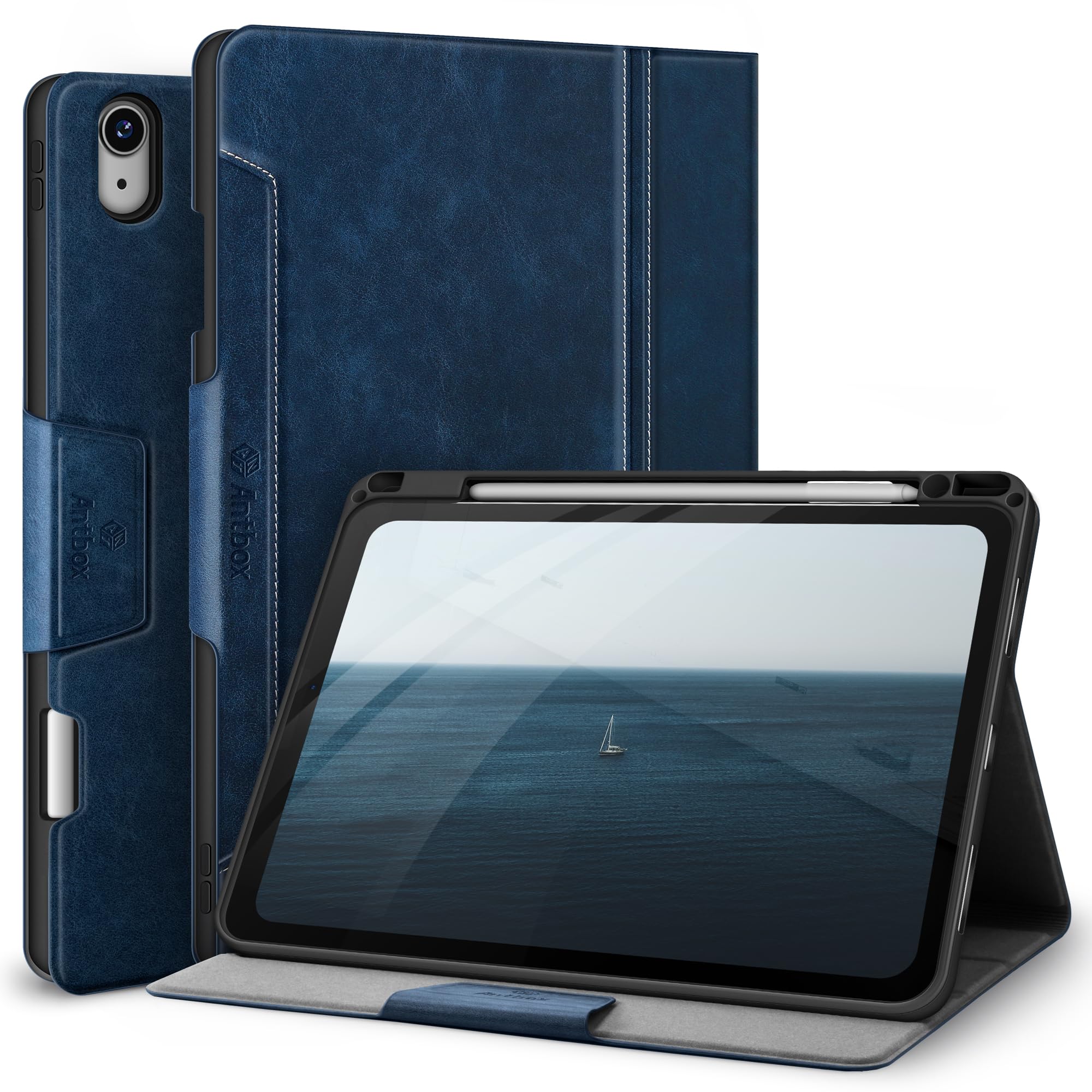 【在庫処分】Antbox iPad Air 11 インチ ケース M3 (2025) / M2 (2024) Pencilホルダー iPad Air 第7/6/5/4世代 ケース オートスリープ対応 ひび割れ防止 ソフトPUレザー製 マルチスタンド機能付き (ブルー)