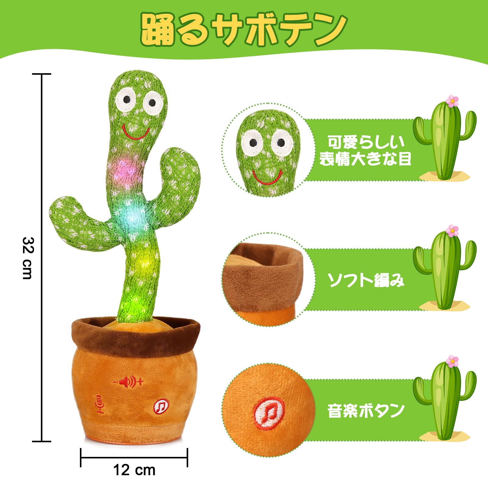 注意:6歳以上の子供向け。【ぬいぐるみ素材】dancing cactus toyは無毒で無害なぬいぐるみ生地、柔らかく快適な生地を使用しているので、肌に害を及ぼすことはありません。子供の日、この踊るサボテンをプレゼントとして子供に送ります!サイズーこの明るいダンスサボテンは、高さ約32cm、重さ約220gです。