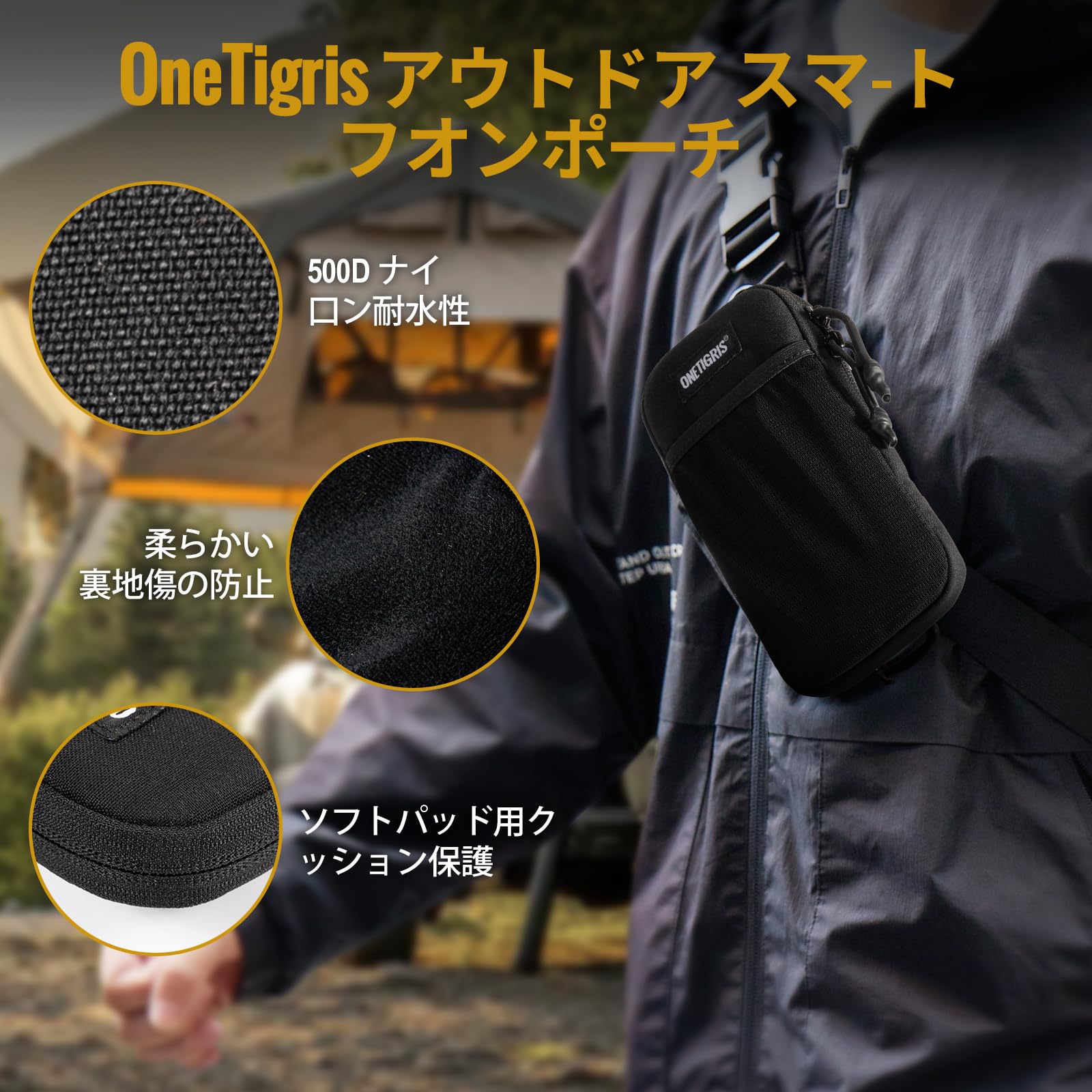 耐久性良い:リュック ポーチの外側は撥水加工が施された丈夫な500Dナイロン素材で、内側は柔らかいスエード調の裏地とパールコットンのクッション材が使用されています。これにより、衝撃からスマホを守り、傷を防ぎます。