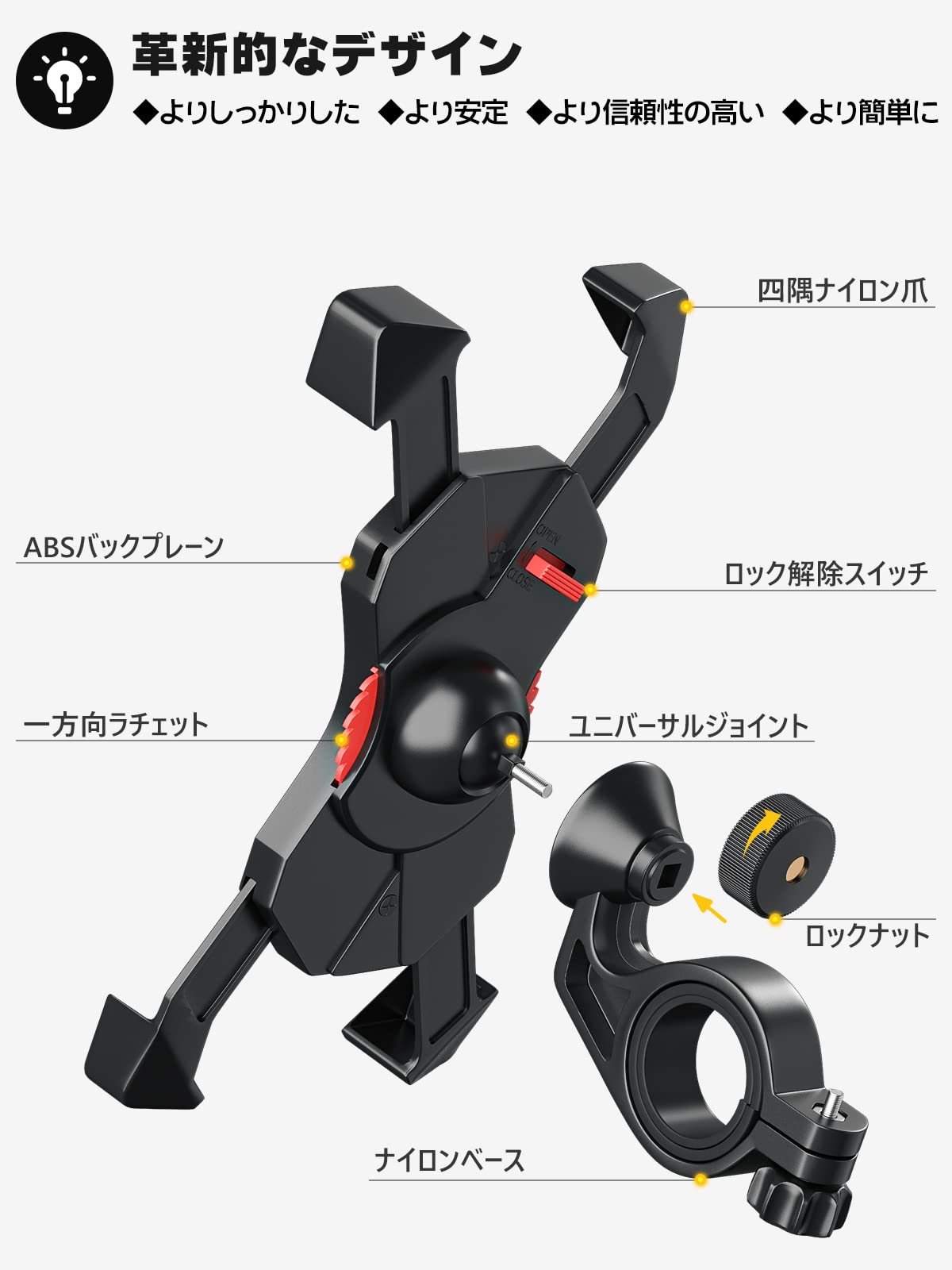 【構造が頑丈で安定】四本爪を持つフォックで携帯を固定し、ギヤでフォックを連動させてしっかりと固める。強烈な振動でも携帯が落ちない。落下率をゼロにし、様々な道路状況に適し、非常に安定で頑丈です。