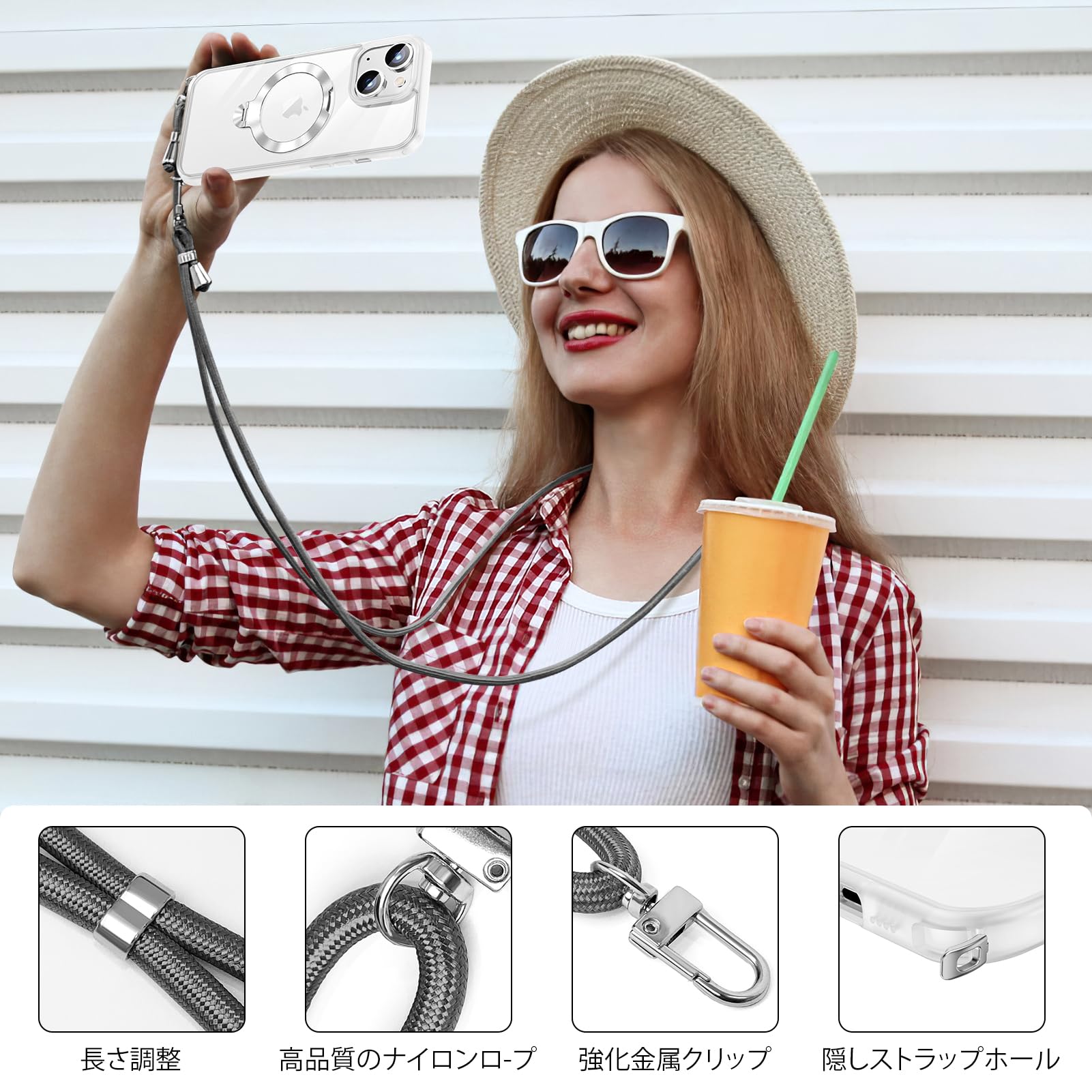 【隠せるストラップホール】 必要に応じて使える隠しストラップ穴付き。付属のショルダーストラップは長さ調整可能で、肩掛けや斜め掛けが可能。落下防止や両手解放で、旅行・ショッピング・撮影・サイクリングに便利。