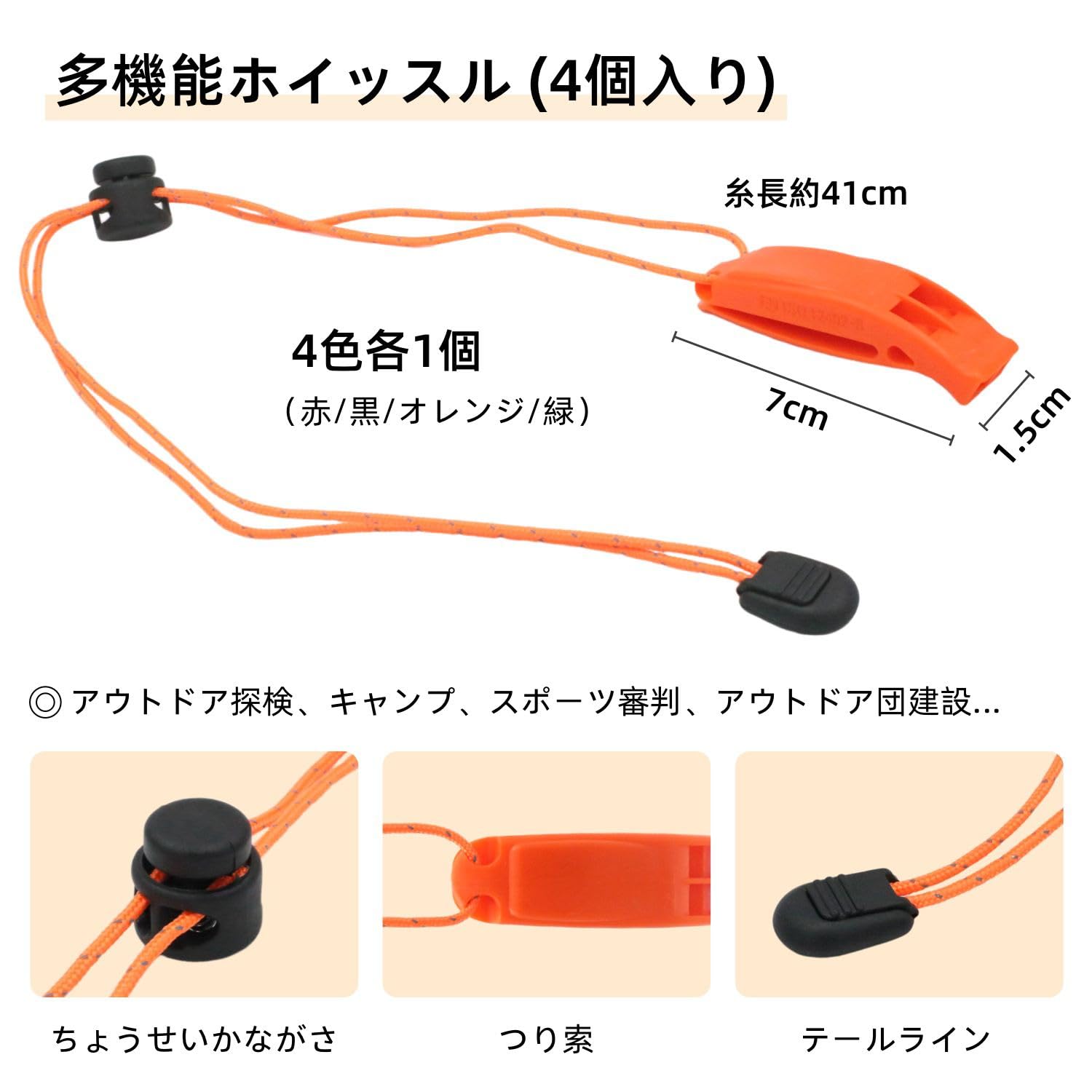 【製品詳細】4色(赤/ブラック/オレンジ/グリーン)のアルミホイッスル4個セット。寸法:70*15mm、糸長約41cm。コンパクトなサイズで持ち運びに便利、防水PP素材で頑丈。