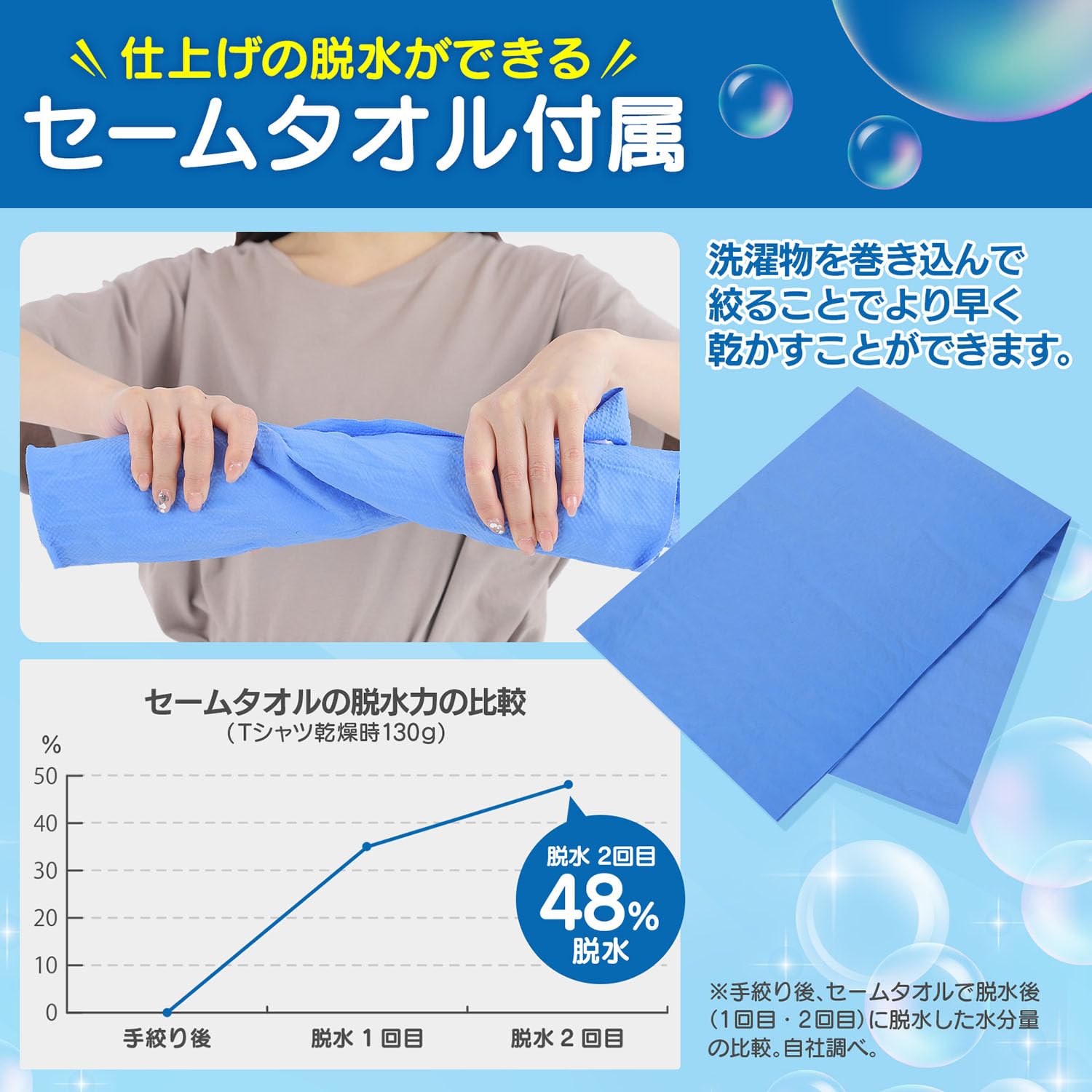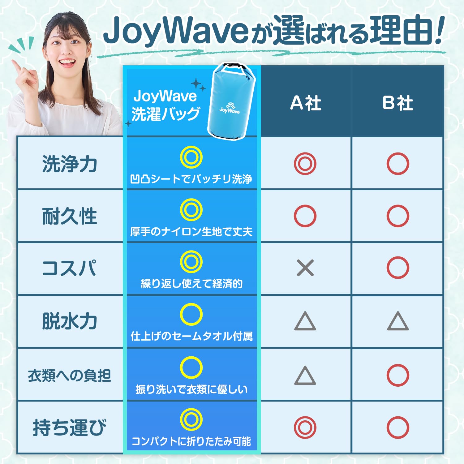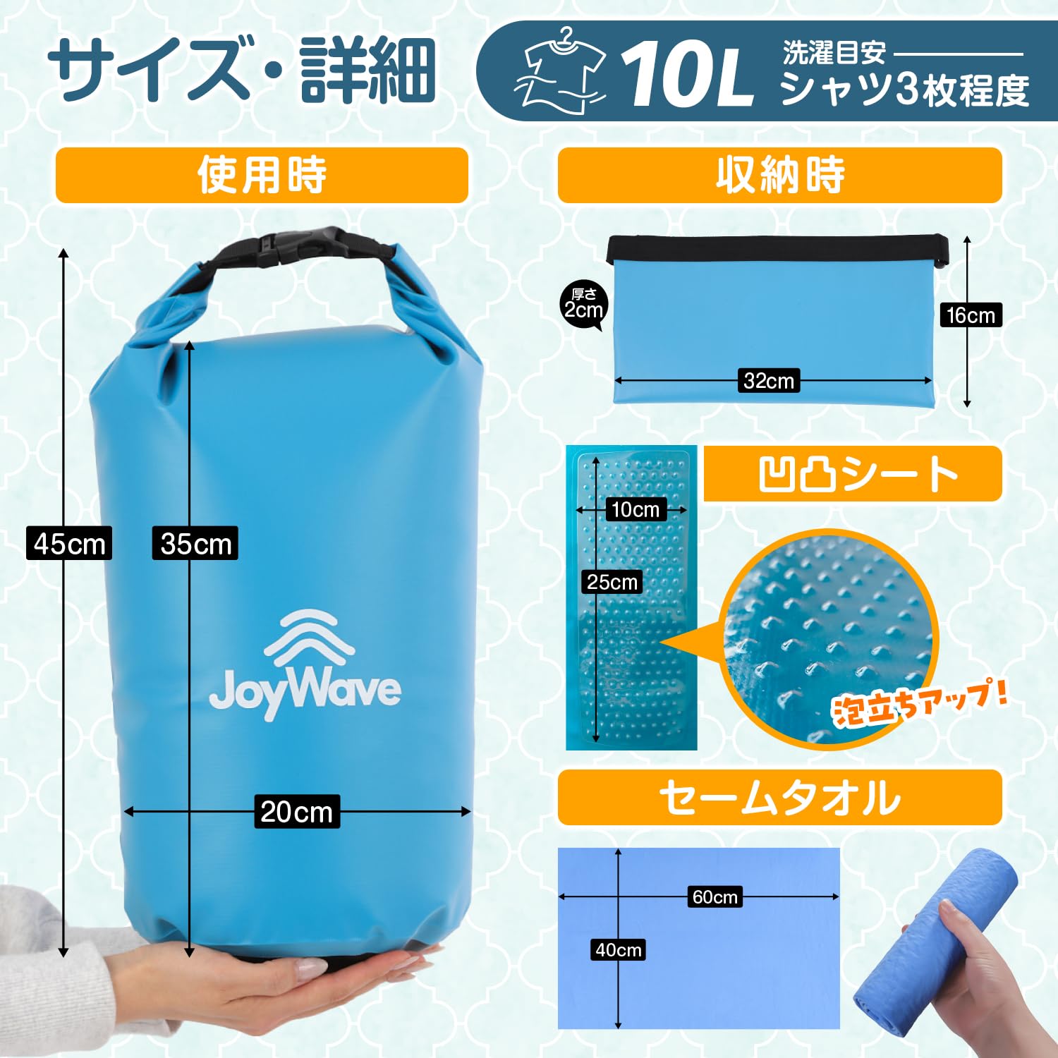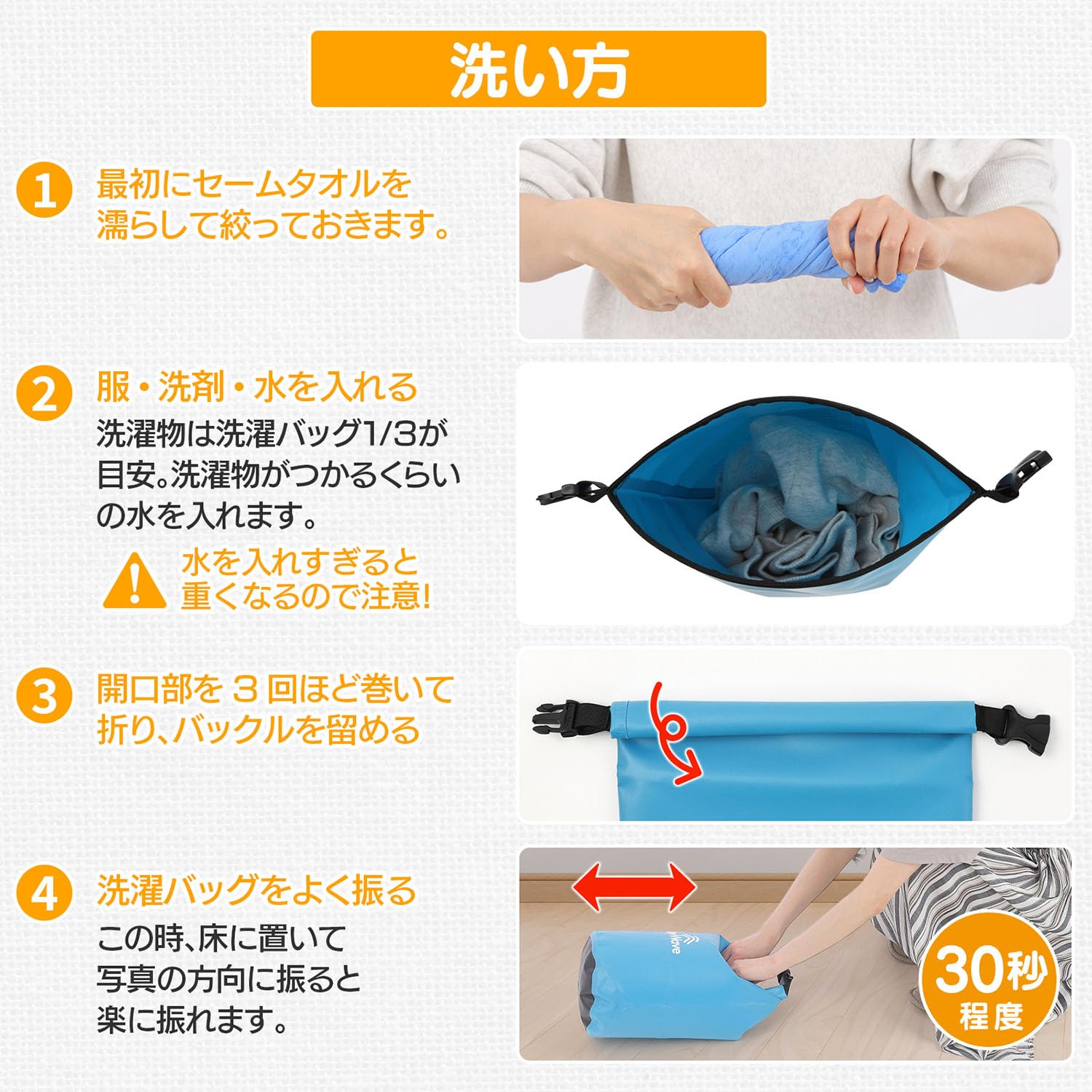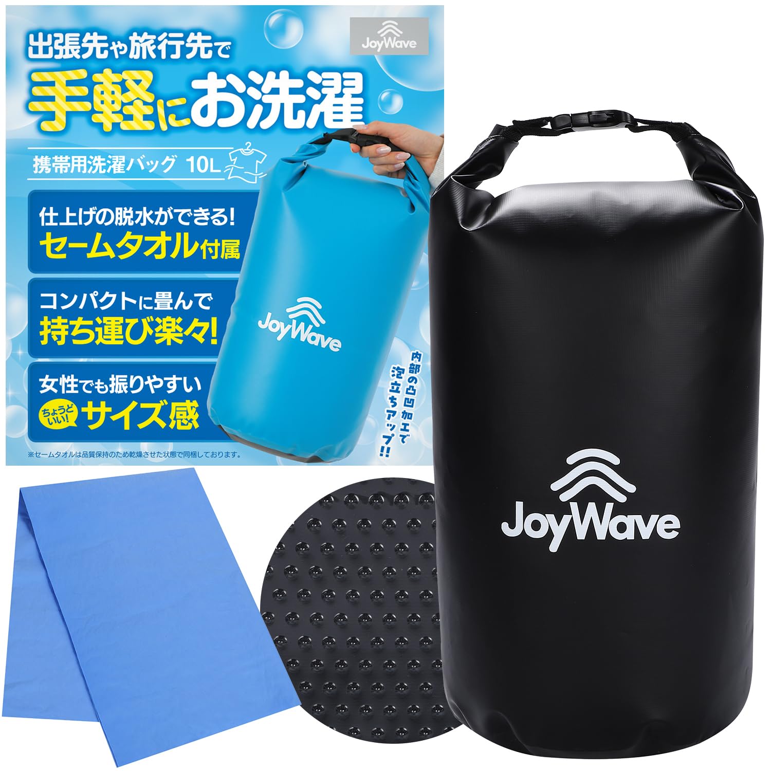 「JoyWave」の洗濯袋は、旅行先・出張先やアウトドアで活躍するコンパクトに折りたたみ可能な洗濯袋です。荷物を減らしたい、旅行先で服を汚してしまった、キャンプ場で洗濯したい等々、あらゆる場面で大活躍!付属のセームタオル使用で乾燥時間を短縮可能です。(セームタオル使用後は、広げて乾かしてください)