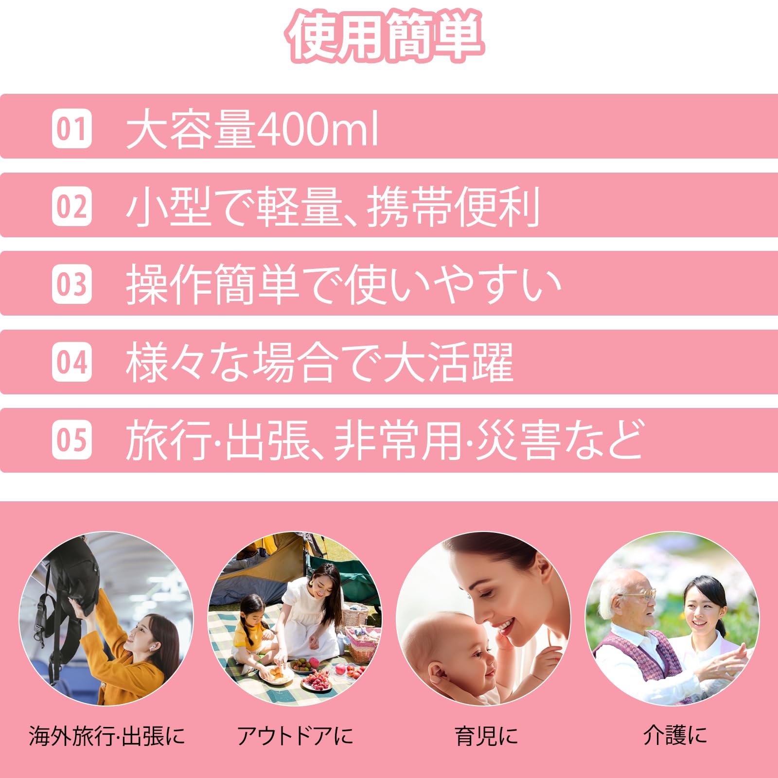 【使用簡単】水を入れて、伸縮ノズルを引き出して固定して、軽く押して使用できます。男女兼用です。操作簡単で非常時の備えにもおすすめです。大口径のデザインでブラシで手軽にボトルの内壁を洗えます。