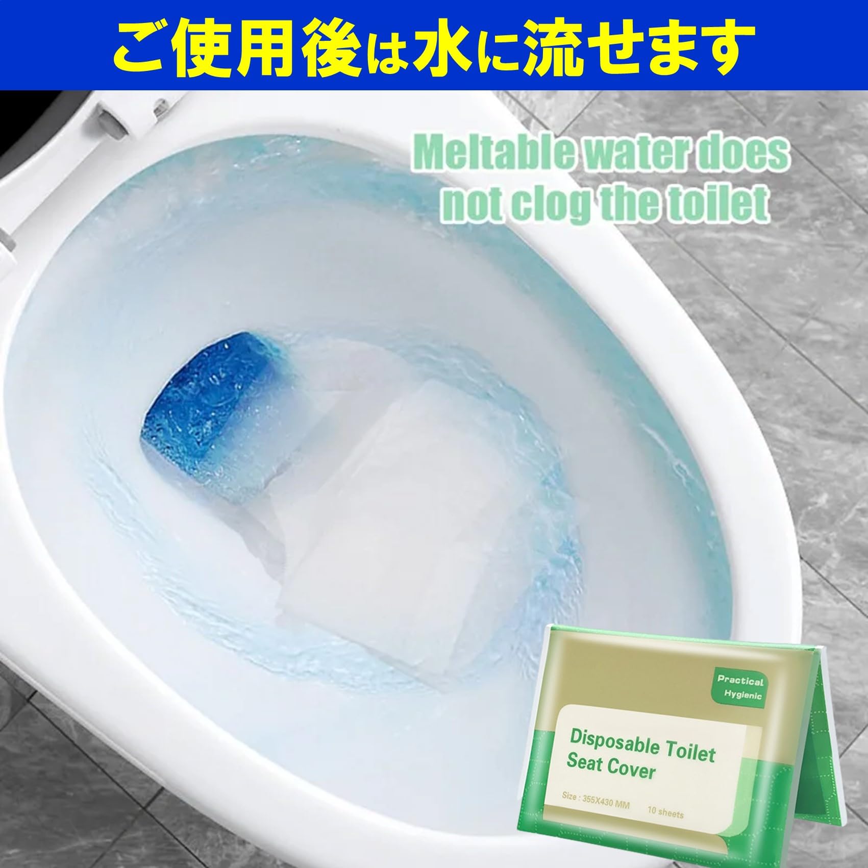 【ご使用方法】 ①パックから便座シートを取り出します。②便座の上に広げて中央のジョイントを外します。中央部のベロの様な部分(水跳ね防止)は便器内に垂らしてください。③便座の上にセットします。④使用後は水に流して完了です。