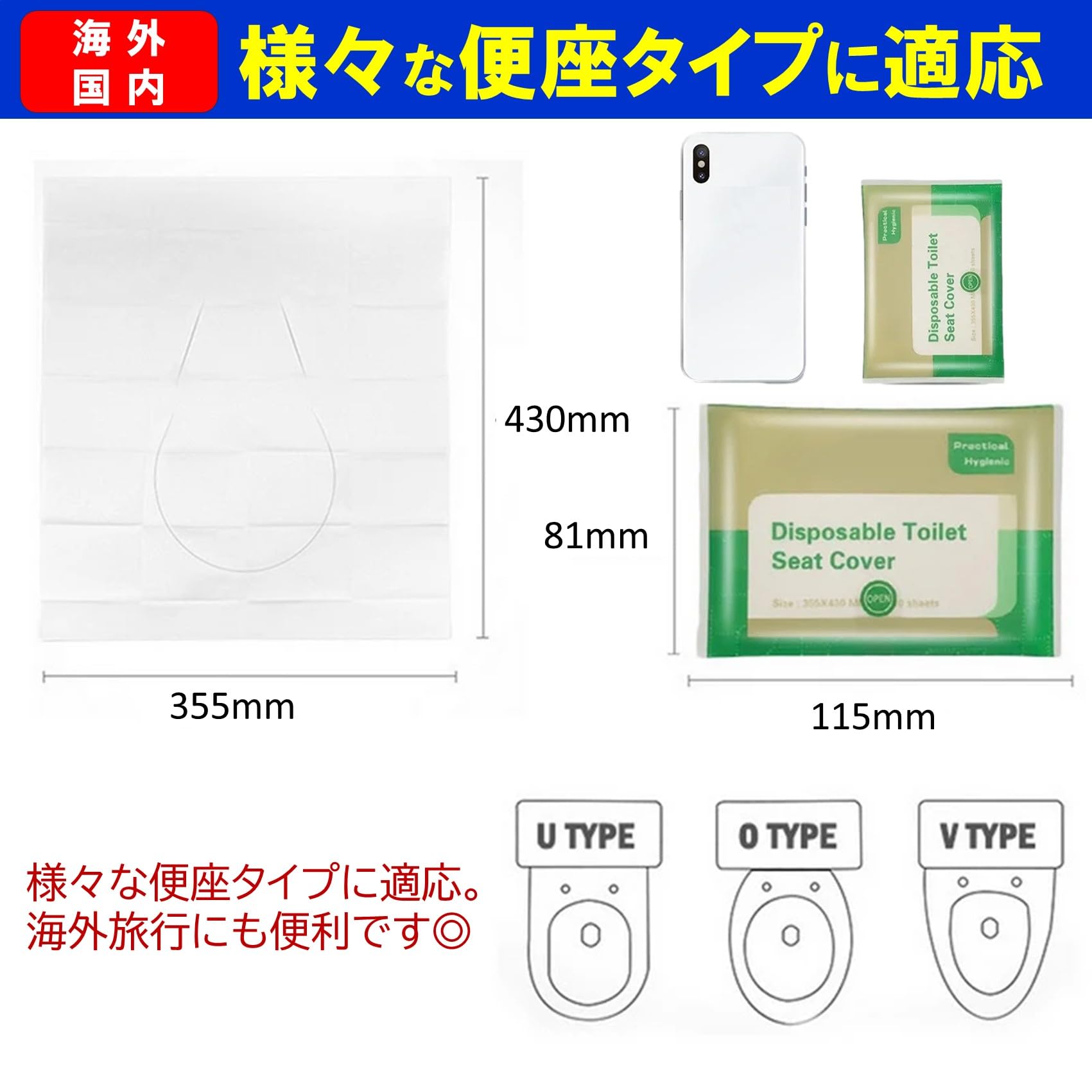 便座シートのサイズは430×355mmです。U型、O型、V型様々な便座タイプに適応します。海外の大き目な便座サイズにも適応します。トイレの清掃が行き届いていなかったり、便座の無いトイレもありますので、海外旅行には是非携帯してお役立てください。