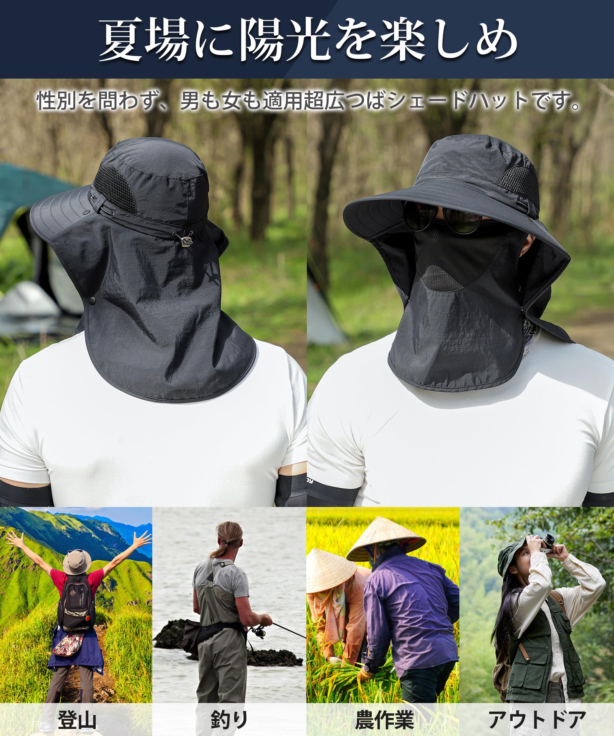 【360°全方位紫外線遮断】安心の物理カットUPF50+(衣類の紫外線防御指数UPF値の中で最高値)。UVカット率99.9%以上で、つばが広めで、日焼け止め、紫外線防止、UV効果の強い日差し季節には最適です。これは帽子、フェイスマスク2つの部分に分かれ、自由に組み立て使えるようになりました。UVケア機能を備え、正面、上、横、後ろなど様々な角度からの紫外線をしっかりガードし身を守ります。顔・首・頭の日焼け防止としてはもちろん、暑さ対策やマスク代わりにもなる便利グッズ。