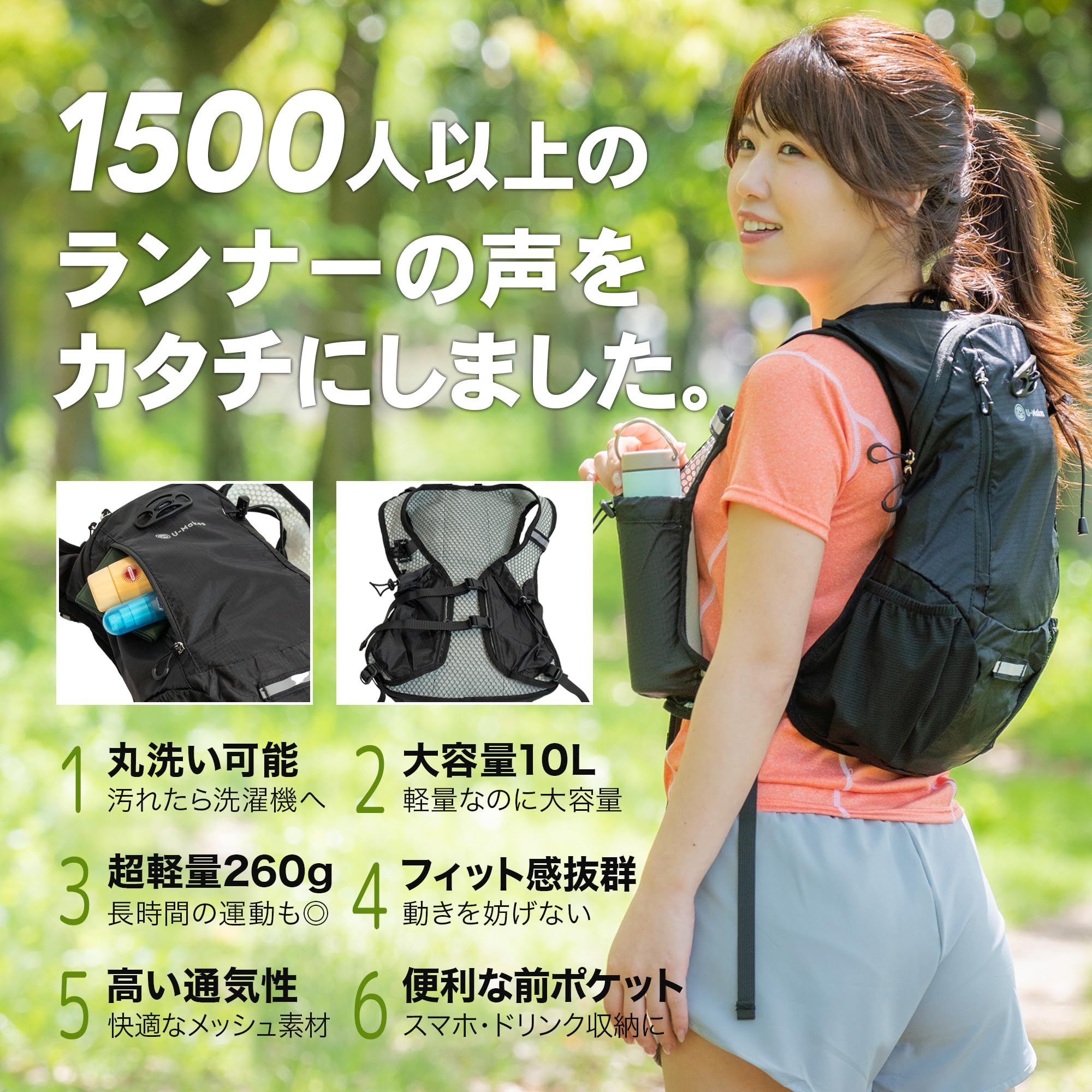 【新着商品】[U-Makes] 【箱根駅伝選手も推奨】 ランニング リュック バッグ ハイドレーション トレラン ザック 自転車 トレイル 軽量 10L 揺れない ランバディ (ブラックモデル)