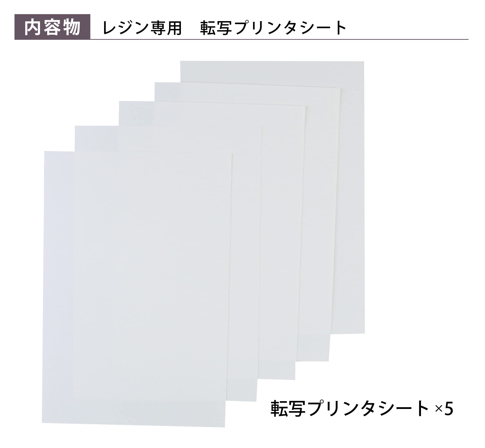 好きな写真やイラストなどをこのシートにプリンターで印刷します。印刷面にレジンをのせて硬化させると転写されたレジンパーツができます。