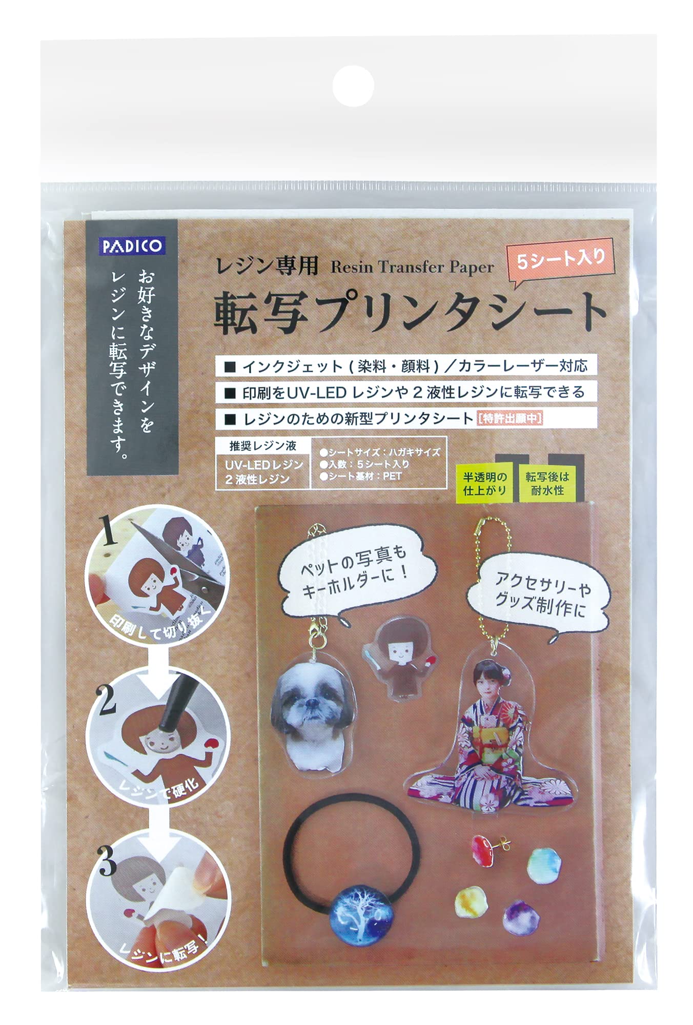 UV-LEDレジン、2液性レジン専用のプリンタ転写シート(特許出願中) このシートにイラストなどを手描きして、その上をレジンで硬化させることで、レジンに転写ができる。 レジンへの転写後は、半透明の仕上がりで、耐水性。 インクジェット(染料・顔料)/カラーレーザー対応。