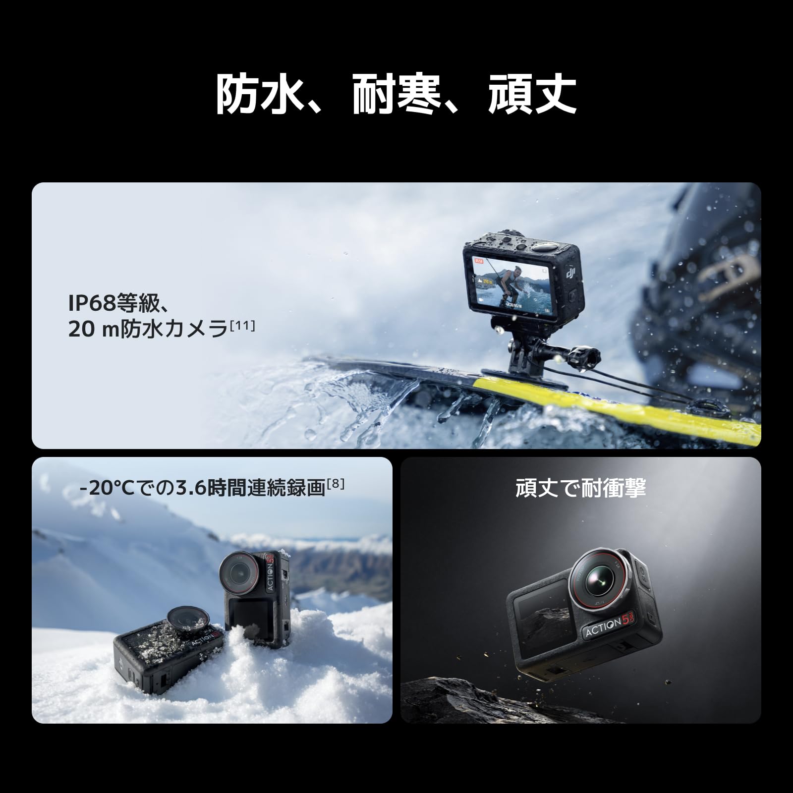 Osmo Action 5 Proには、2種類のベーシックなコンボのほか、次の撮影がどんなスポーツイベントになっても、さまざまなニーズを満たしてくれるコンボをご用意しています。4時間のバッテリー駆動時間で、撮りたい瞬間を逃しません。水に濡れていても、乾いていても、デュアルOLEDタッチ画面で撮影した画像を確認できます。デュアルDJIマイクの直接接続で、高品質な音声収録が簡単に実現します。内蔵の気圧計、水圧計で詳細なデータを測定し、ソーシャルメディアで共有できます。