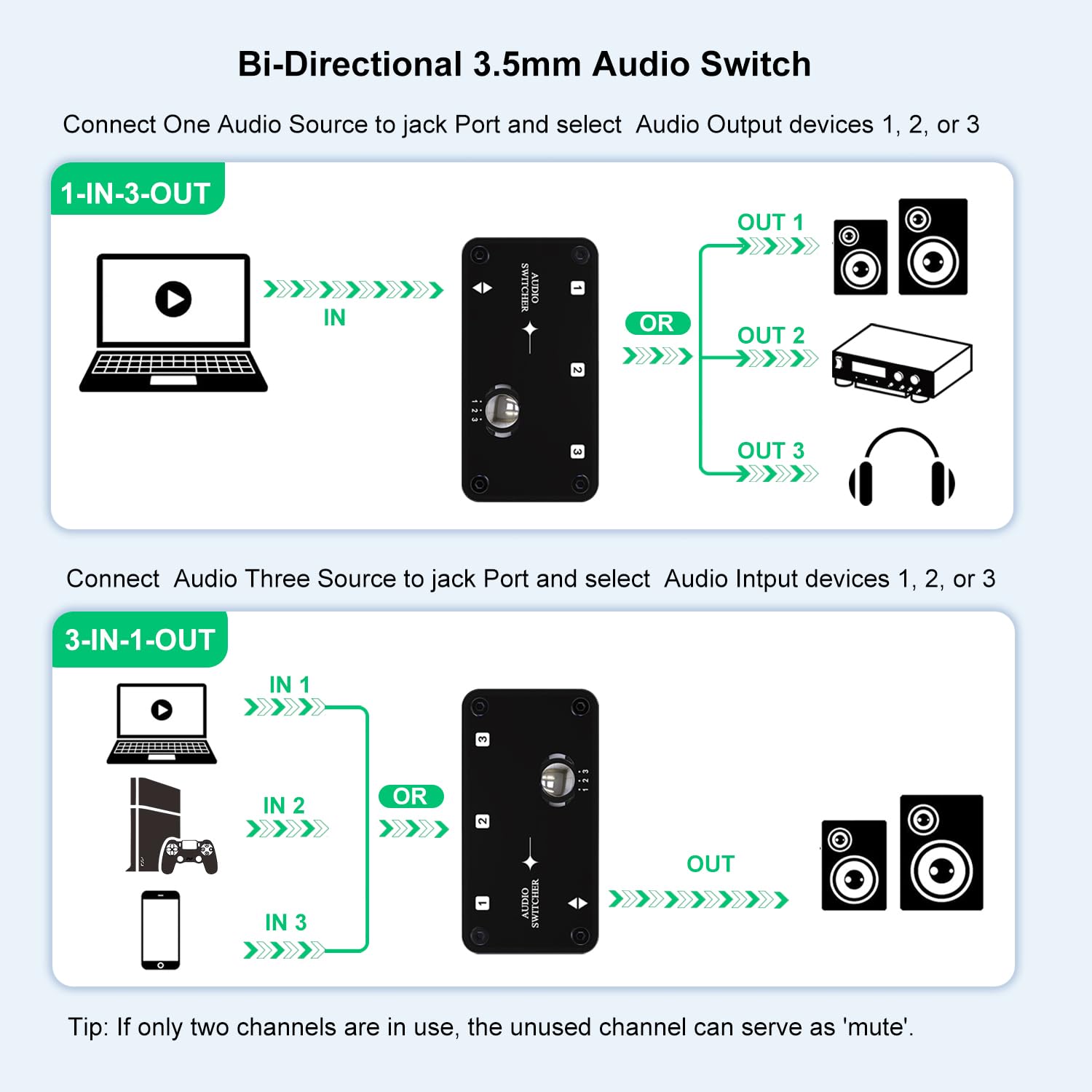 【双方向3.5mmオーディオスイッチ】プラグアンドプレイ、電源不要。 1X3(1つの入力から3つの出力へ)または3X1(3つの入力から1つの出力へ)3.5mmインターフェースオーディオセレクターは、複数のオーディオ受信デバイス(スピーカー、ヘッドフォンなど)またはオーディオソース(携帯電話、コンピューターなど)間で簡単に切り替えるために設計されています。