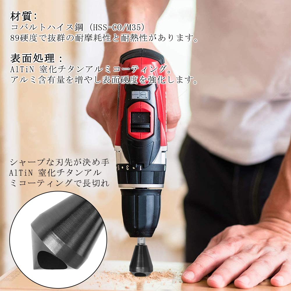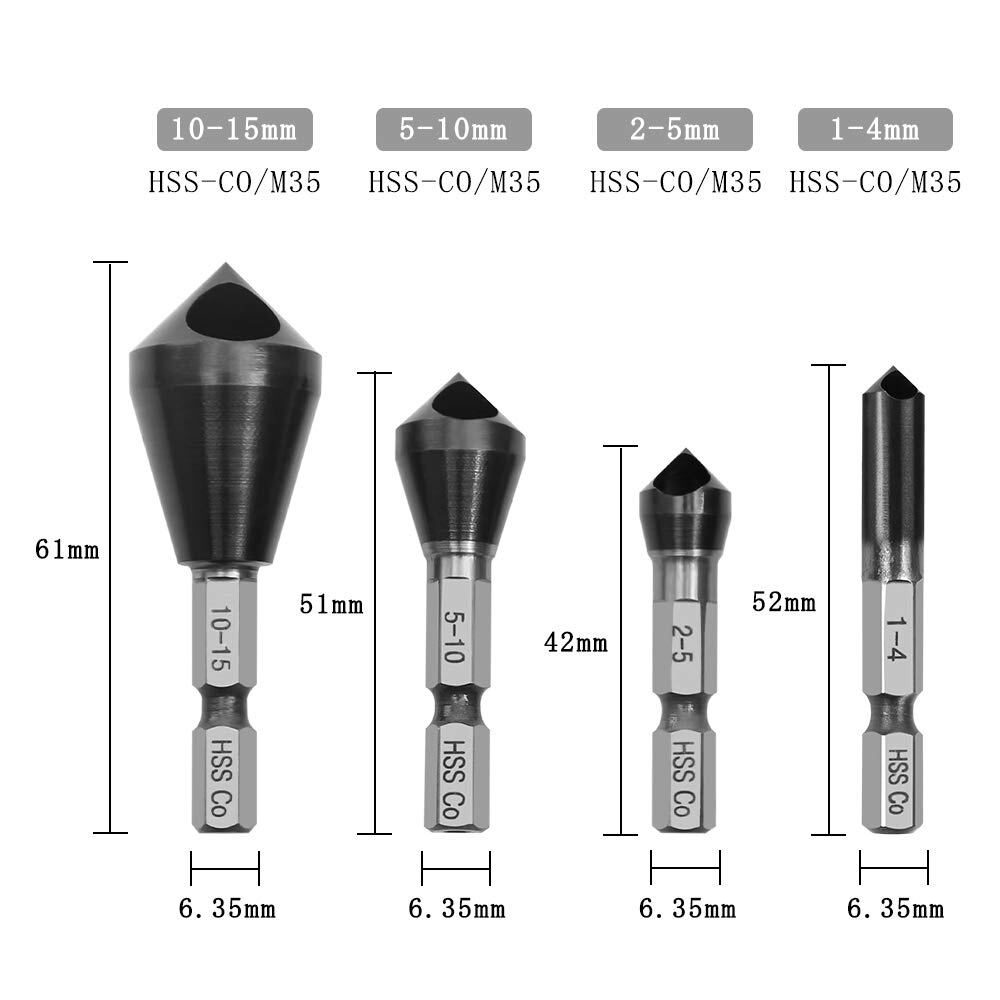 【商品仕樣】セット内容:4本セット。サイズ:1-4mm、2-5mm、5-10mm、10-15mm(各サイズ1本ずつ)面取り角度:90°。材質:コバルトハイス鋼 (HSS-CO/M35)。六角軸:6.35mm。表面処理:AlTiN 窒化チタンアルミコーティング。