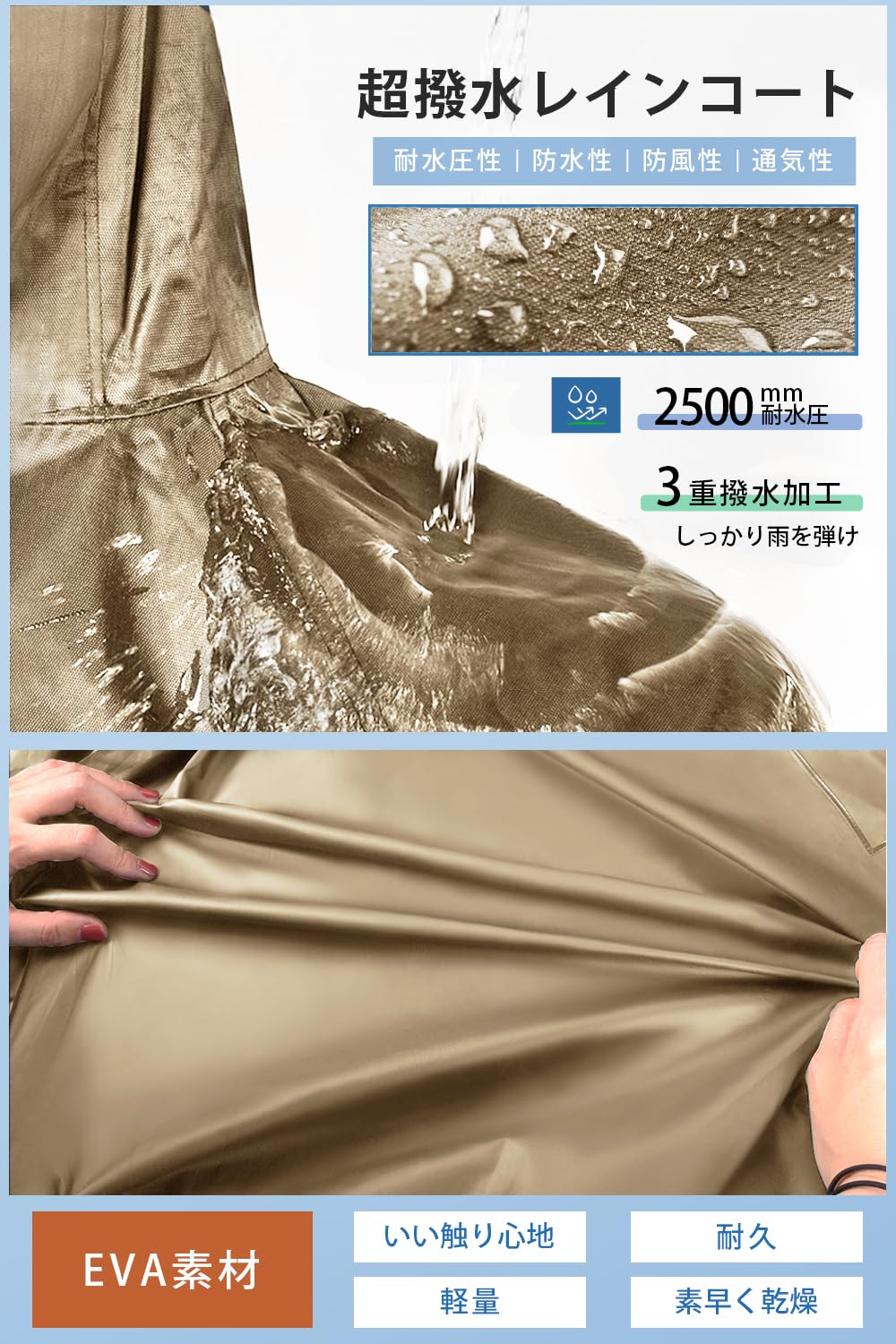【超撥水*防水*耐久】ファスナー+ボタンの二重設計により、ファスナーを閉じてボタンを留めることで雨水や風の侵入をしっかり防げるレインコートです。エコなEVA素材を採用し、防水力高め、耐水圧2500mm、丈夫で耐久性にも優れています。3重撥水加工により、水が染み込むことはない。収納袋付き、リュックサックなどに入れて楽々持ち運べるので、旅行や出張、アウトドアに急な雨が降っても心配はありません。