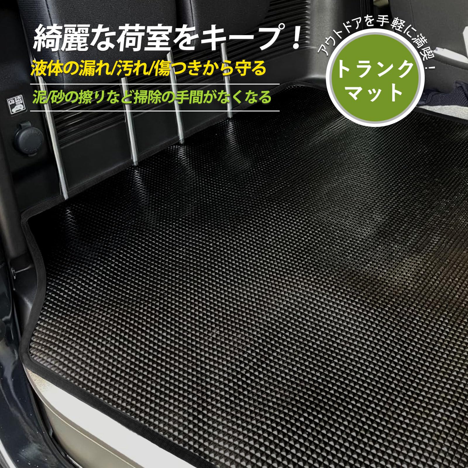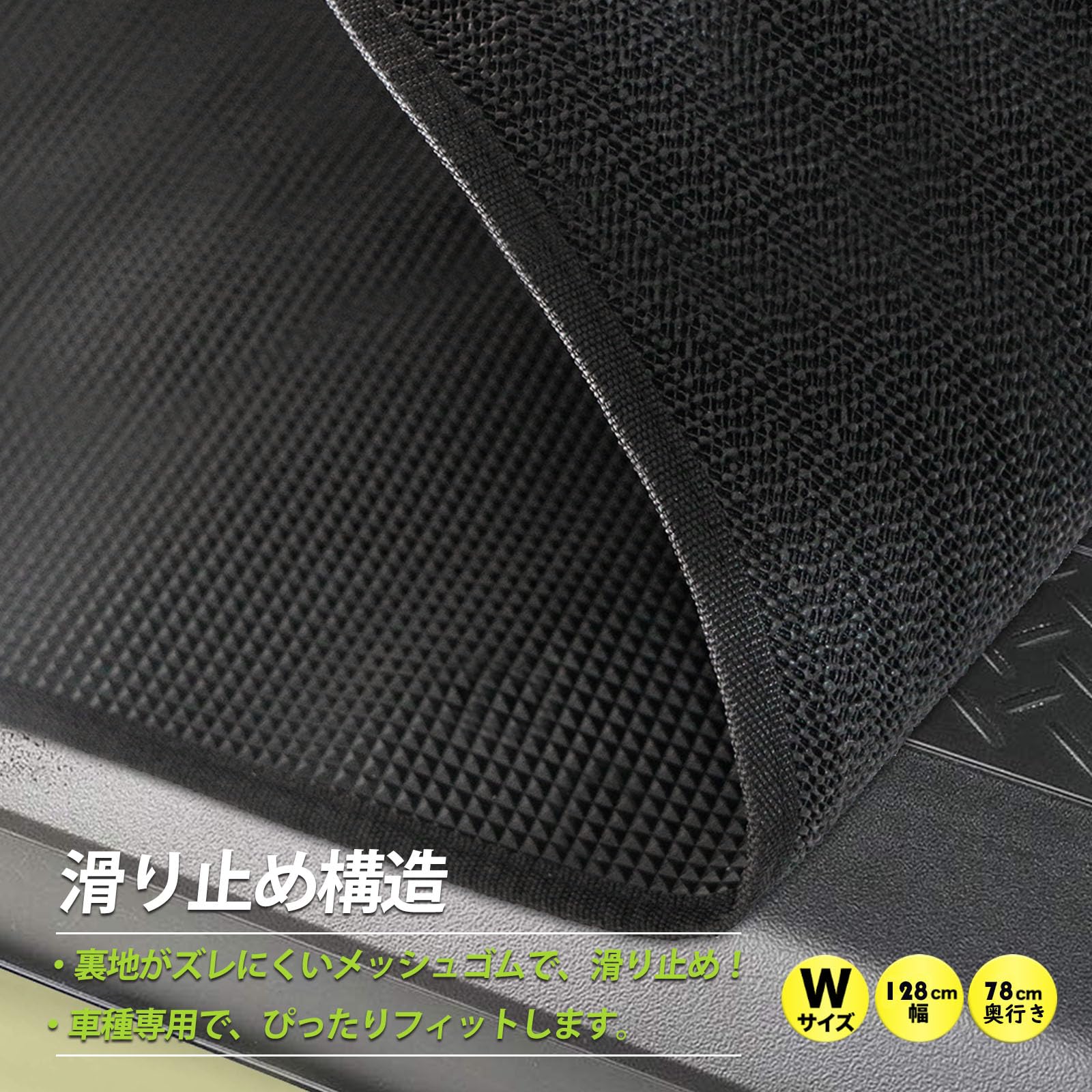 【滑りとめ】裏面は厚いメッシュゴム付きで、マットが滑ることなく、ドライブ中もご安心。お荷物の滑りやズレを徹底的にブロックします。縁取りのカラーがブラック、レッド、グリーン仕様で、愛車のボディカラーに合わせ選択できます。