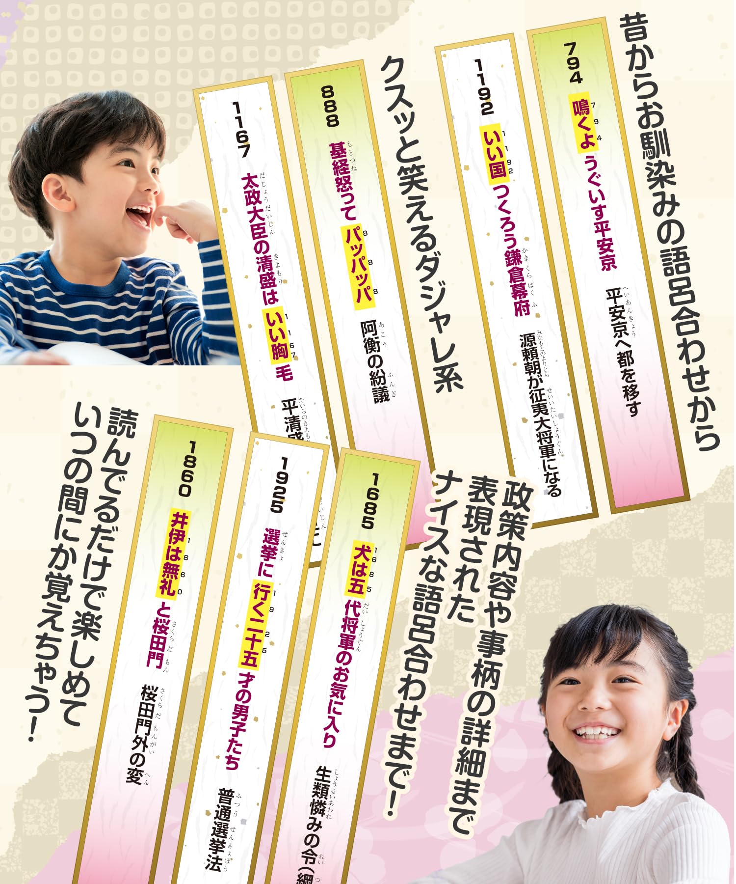 語呂合わせで覚える:覚えにくい歴史の出来事や年号を、ユニークで覚えやすい語呂合わせで紹介しています。ダジャレ感覚で楽しみながら学べるため、記憶に残りやすいです。