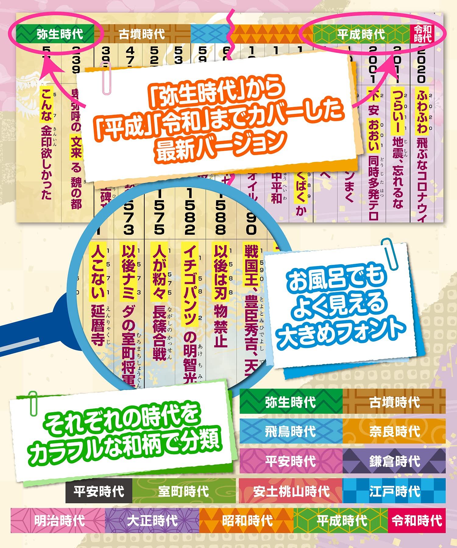 最新バージョン:弥生時代から令和時代まで、日本の歴史を網羅する最新の年表です。時代ごとに色分けされており、一目で区別できるようになっています。
