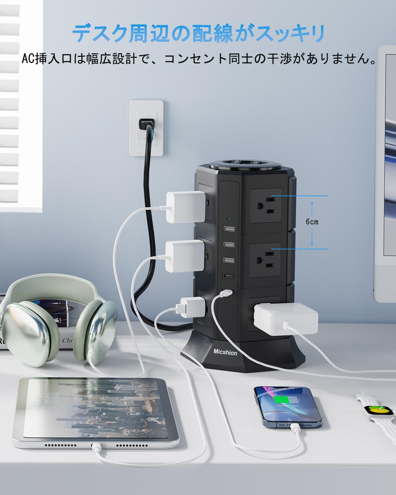 ?【なんでも挿せるコンセントタップ】このタワー型の電源タップ、直方体で1面あたりの面積を広めに取ってあるので120WのAC充電器(幅6cmほどのアダプタ)をそれぞれ挿していっても全く触れ合うことなく、すっきり接続できます。そして、2メートル延長コード付きテーブルタップで、コンセントから距離があっても配線可能です。パソコン、プリンター、シュレッダーなどの各種デバイス類のAC電源、加えてスマホやタブレットのUSB電源を本製品1台で全ての電源をすっきりスマートに集約できます。