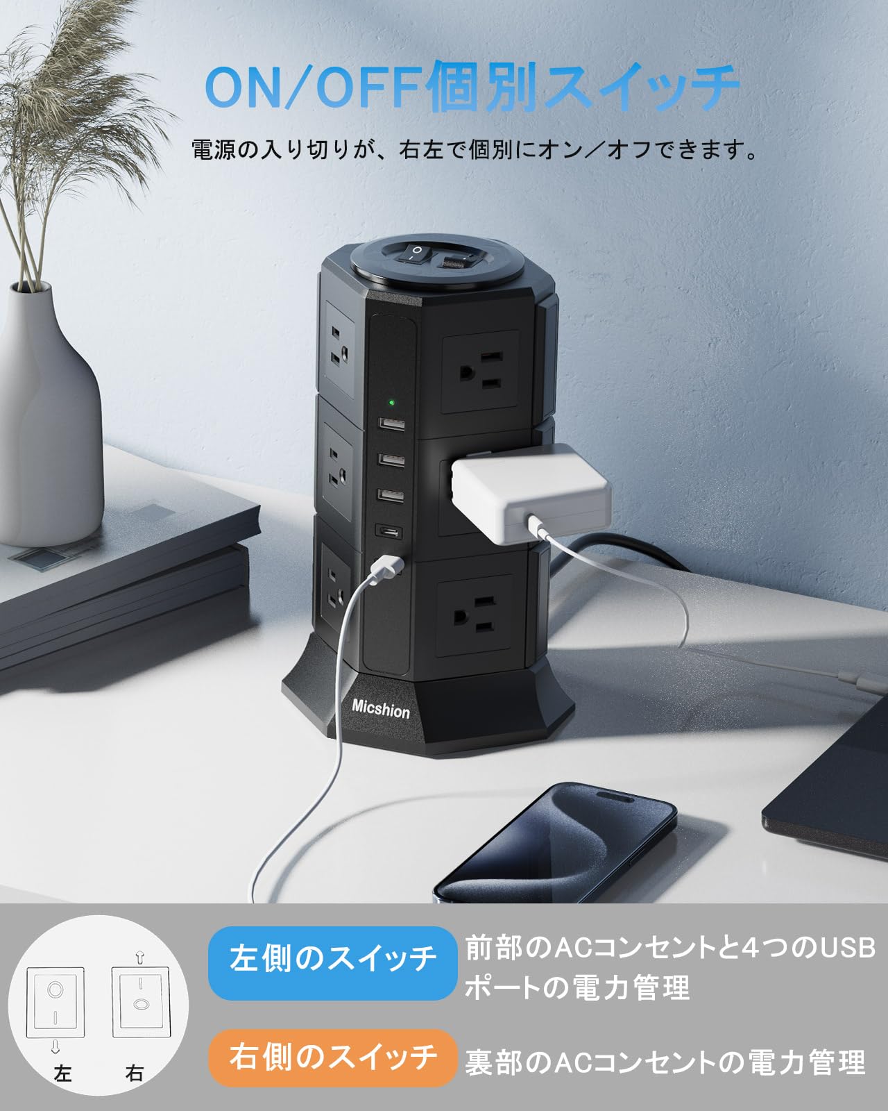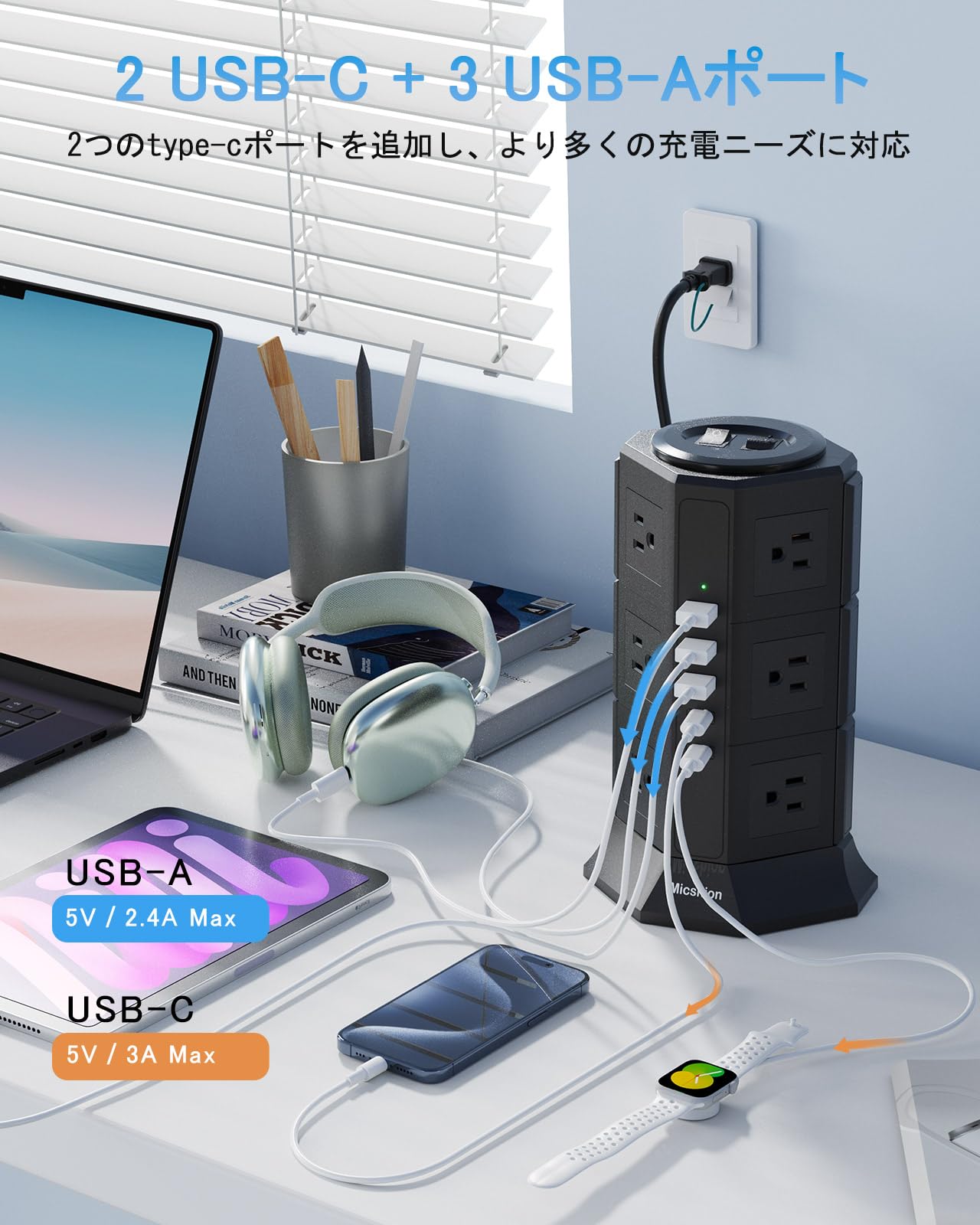 電源タップ タワー型 5個USBポート (2個USB-C+3個USB-Aポート) 12個コンセント 2m 急速充電 個別スイッチ 3段 コンセントタップ 過負荷保護 安全保護機能 自宅用 会社用 1年間品質 ブラッグ (3層 黒)