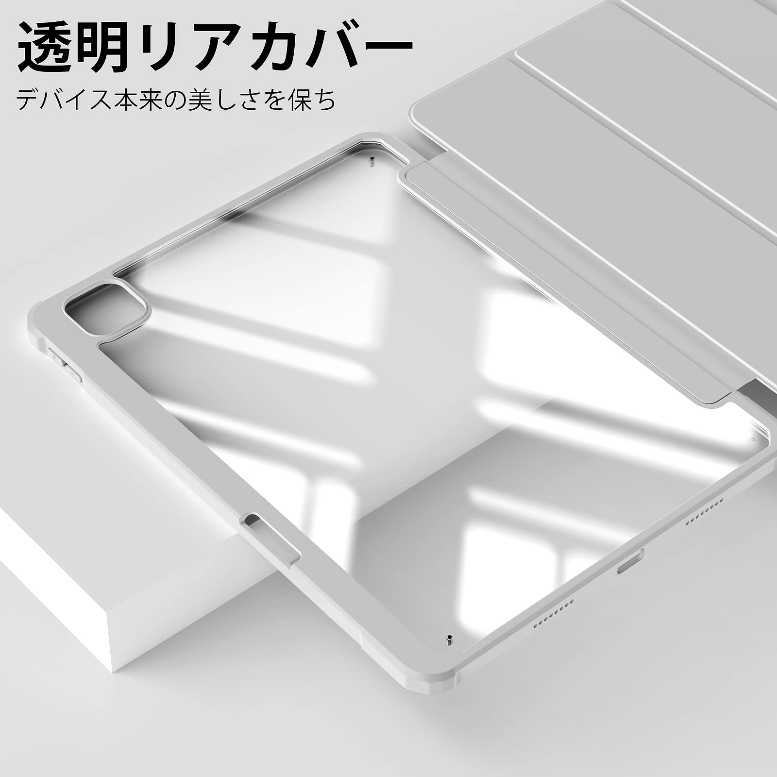 【材質&外観】ケースの表面はPUレザー素材を利用して、軽量、超薄を備えます。透明バックカバーの枠は柔軟な TPUを採用して、取り付けも簡単にできます。軽量のソフトシェル設計により、シェルの体積を増やすことなく保護を向上できます。電源ボタン、音量ボタン、スピーカー穴等、iPadを隅々までカバーし、非常に優れた保護力を発揮。(注:透明部分の表裏の保護フィルムを剥がしてください)