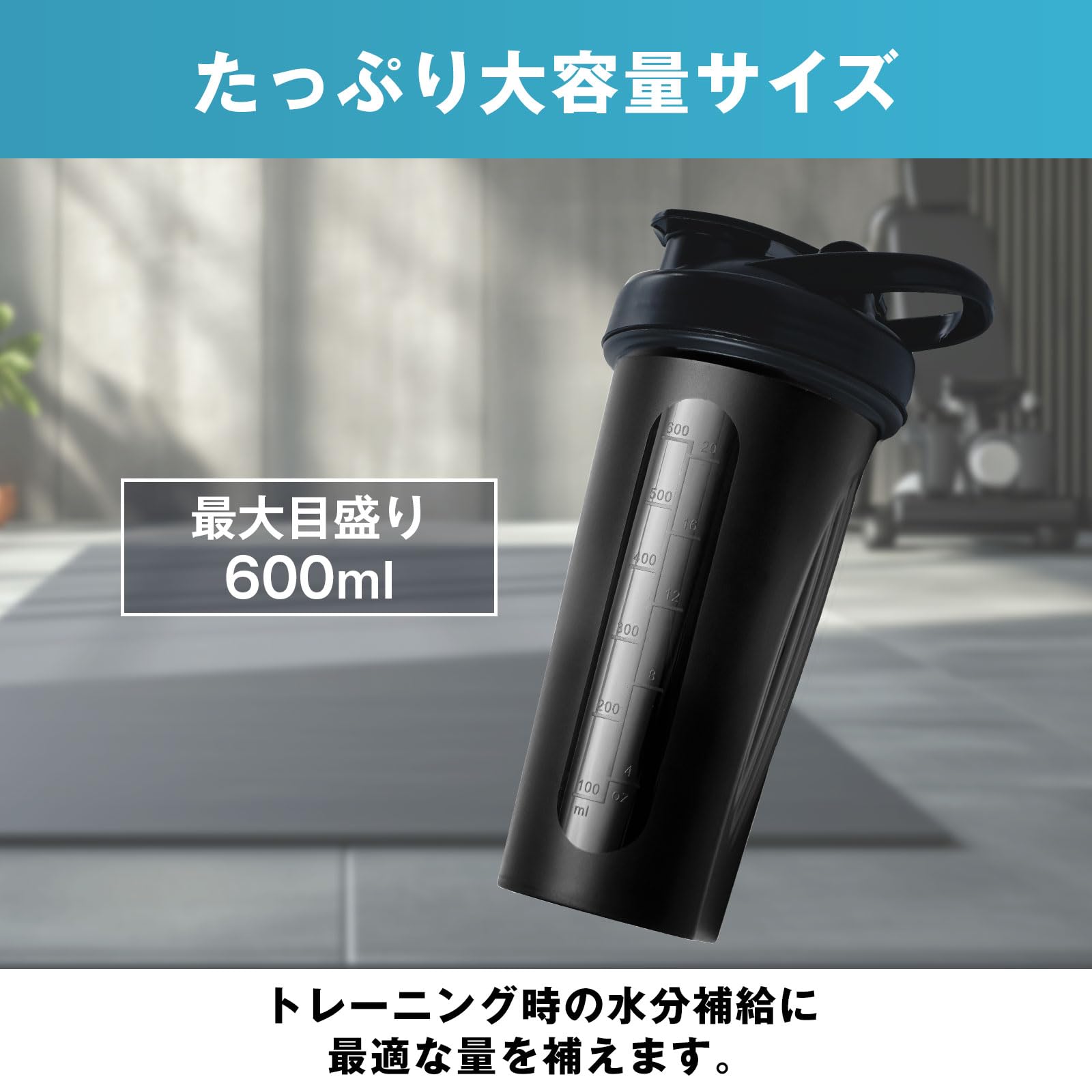 ??【最大目盛り600mL大容量】 プロテインやEAA・クレアチン・グルタミンなど、様々なドリンクに使いやすい「プロテインシェイカー/色:ブラック」です。
