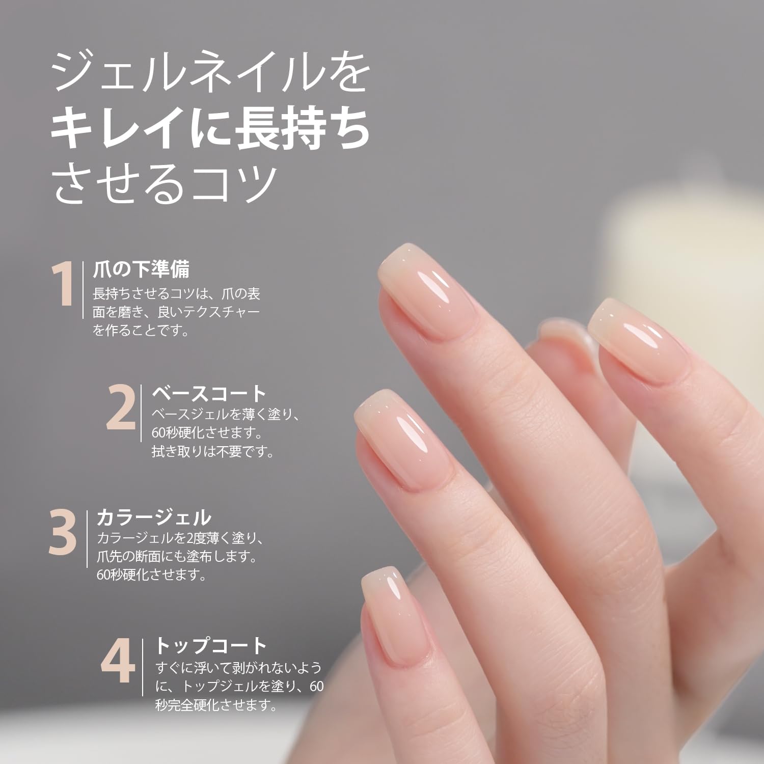 4週間長持ち: ベースジェルを塗る前に爪の表面をなめらかに整えると、良いテクスチャーを作ります。カラージェルの後にトップコートを塗ると、ちゅるんとしたツヤ感のある仕上がりになります。