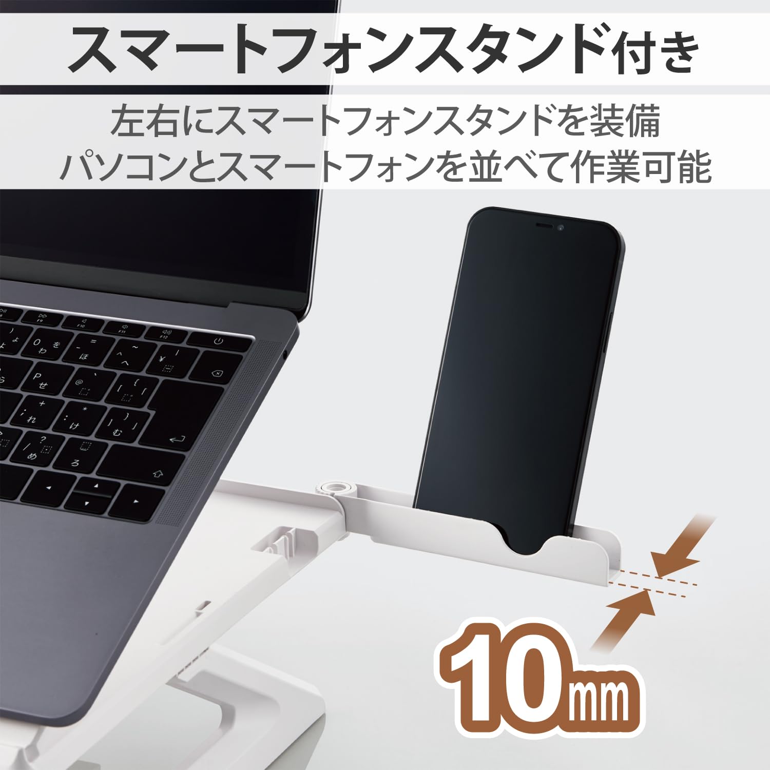 8段階角度調整機能と高さアップ脚付の折りたたみ式ノートパソコンスタンドです。 ノートパソコンスタンドの左右にあるスマートフォンスタンド機能により、パソコンとスマートフォンの画面を並べて見ることができます。