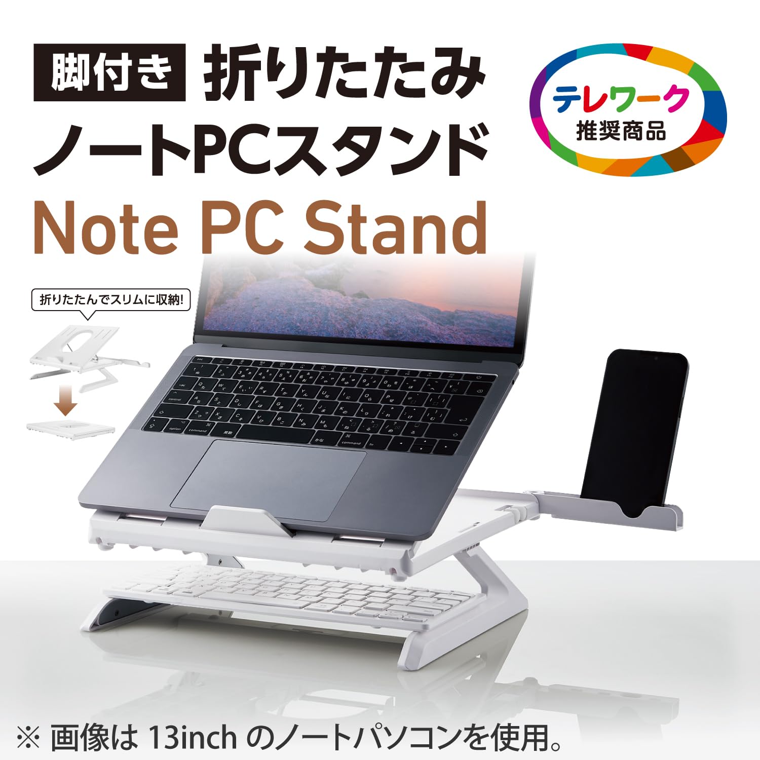 【仕様】■対応サイズ:~15.6インチノートパソコン ■耐荷重:10kg ■寸法:幅約280mm×厚み約280mm×高さ約26mm ※折りたたみ時 ■質量:約840g ■色:ホワイト ■セット内容:排熱用ゴム脚×2 ■材質:ABS、スチール【説明】■8段階角度調整機能と高さアップ脚付の折りたたみ式ノートパソコンスタンドです。 ■設置することでディスプレイを見る際の目線を上げられるため、パソコン作業の際の姿勢を改善することができます。 ■傾斜角度を23度・27度・31度・36度・40度・47度・50度・53度の8段階に調整可能です。 ■高さを9.5cmアップできる折りたたみ式の脚付です。 ■高さアップ脚を利用すればノートパソコンスタンドの下のスペースを有効活用でき、ノートパソコンスタンドの下のスペースにキーボードを収納することができます。 ■ノートパソコンスタンドの左右にあるスマートフォンスタンド機能により、パソコンとスマートフォンの画面を並べて見ることができます。 ■ノートパソコンにあわせて台座のお好みの位置に排熱用ゴム脚を取り付けることで、ノートパソコンを台座に密着させずにおくことが出来るのでノートパソコンの排熱にも効果的です。 ■底部にはゴム脚がついているので、滑りにくく安定してご使用いただけます。 ■使用しない時には薄くたたんで収納することができます。【商品に関するお問い合わせ】エレコム総合インフォメーションセンターTEL. 0570-084-465FAX. 0570-050-012受付時間 / 10:00~19:00 年中無休