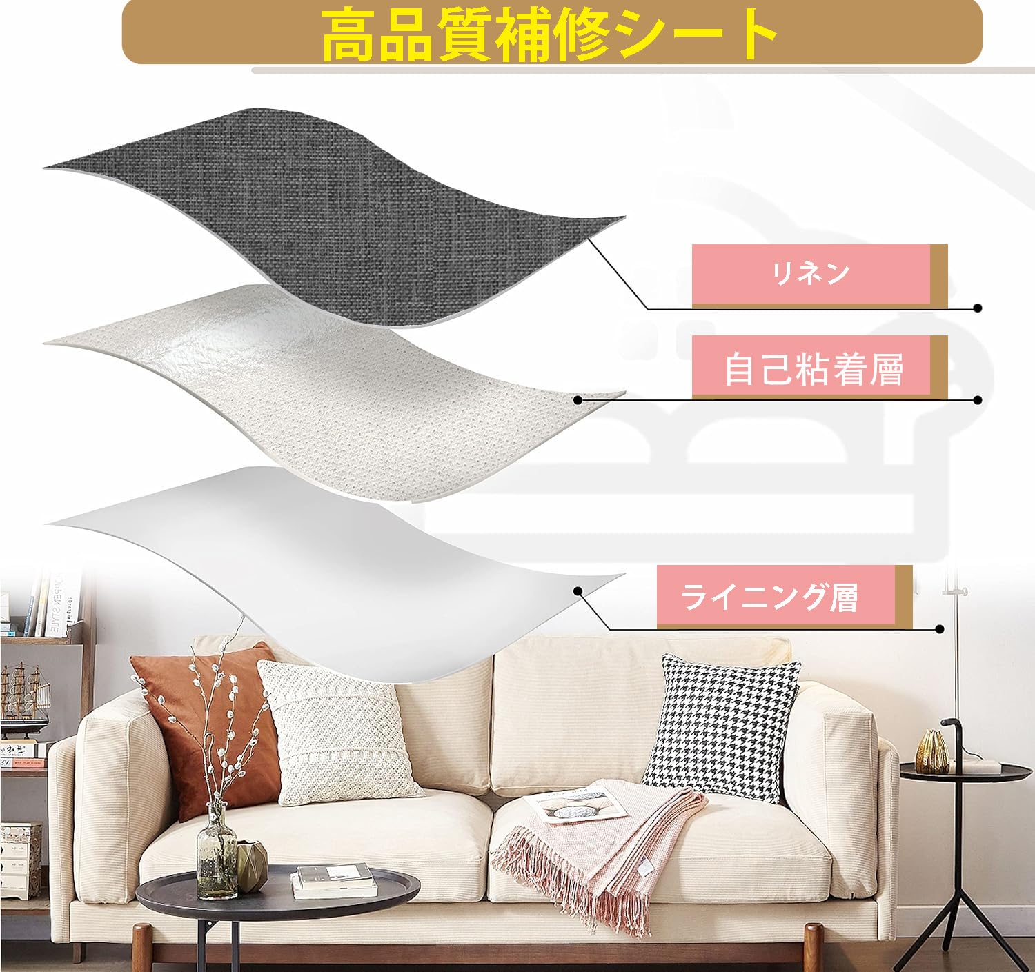 【補修方法】:この補修シートならリネン布の裏が接着シールなので剥離紙をはがして貼るだけ簡単に補修 ご使用の際、補修する箇所より少し大きめに補修シートをカットします。粘着面をクリニングしてから粘着してください。商品の粘着部分にホコリはありません。粘着面にシワができないように貼り付けて下さい。貼り付けた後補修シートの表面から手でしっかり圧着してください。