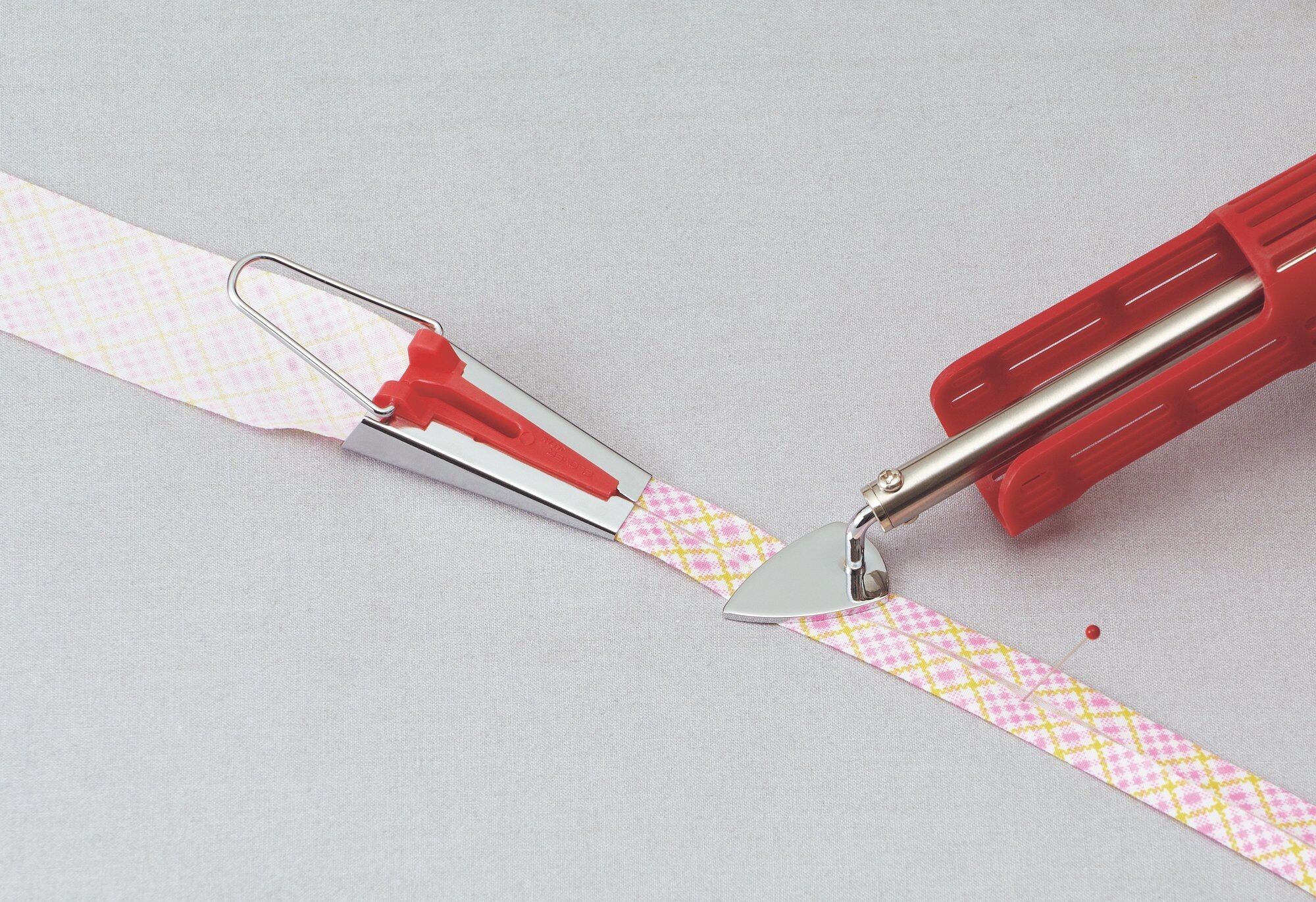 袖ぐり・衿ぐりのパイピングの始末やベルト通しなど、共布で素早く同じ幅のテープ作りができます。