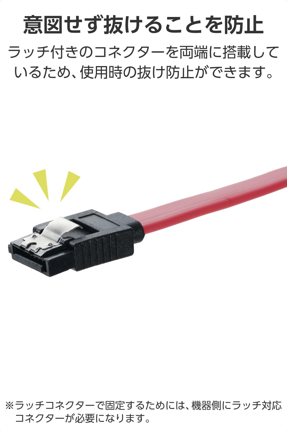 ■ラッチ付きのコネクターを両端に搭載しているため、使用時の抜け防止ができます。ラッチコネクターで固定するためには、機器側にラッチ対応コネクターが必要になります。