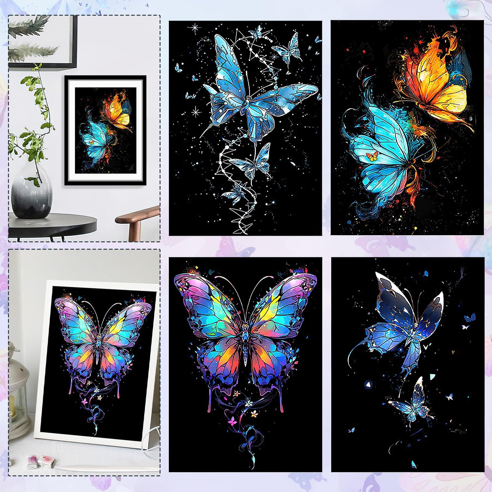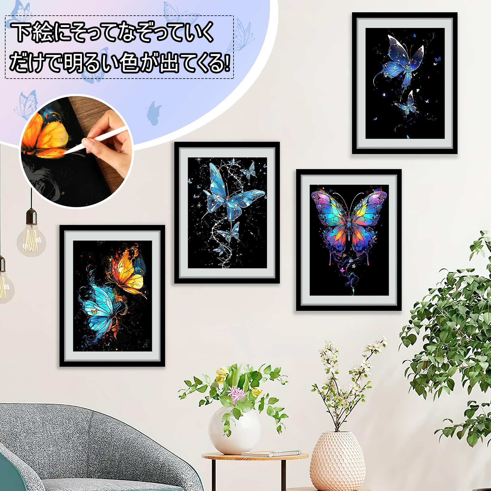 【デザイン】これらのスクラッチアートはすべて蝶のイメージを採用しますが、デザインがそれぞれ異なります。シンプルでエレガントなラインと明るい色が組み合わさって、絵画が生き生きと見え、神秘的な雰囲気が溢れています
