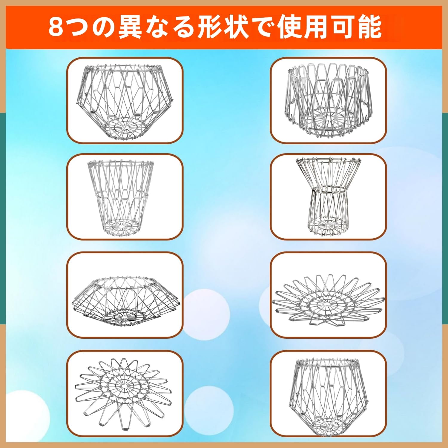 【このバスケットの使い方はとても簡単で】コンパクトに折りたたんで場所を取りません。平らにした状態での直径は18.5cmです。非常に柔軟性が高いため、サイズや形を自由に調整でき、フレキシブルワイヤーバスケットで自分だけのデザインを作ることができます。