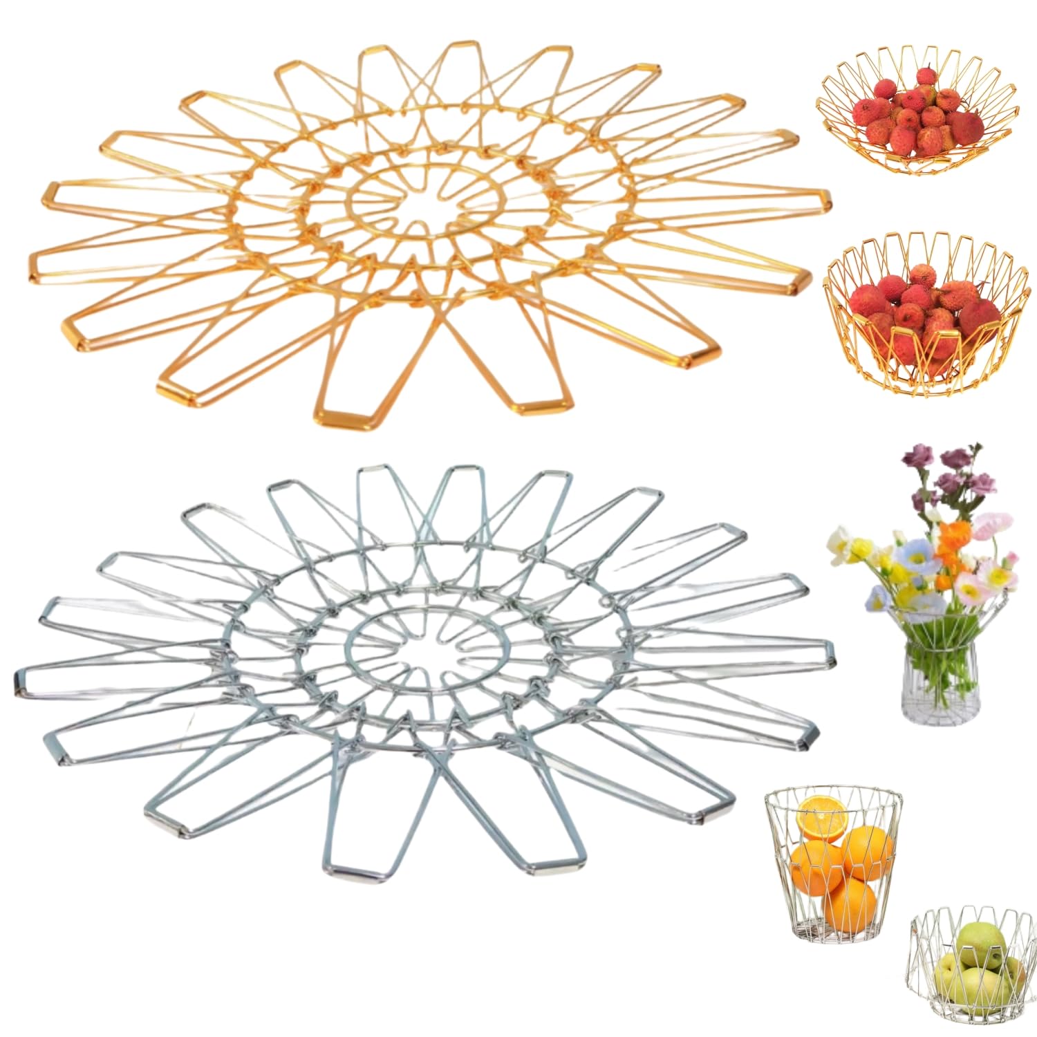 変形バスケット 折りたたみ フルーツバスケット 2個入り【ゴールド、シルバー】 変形自在 大容量 収納かご 防錆 軽量 おしゃれ インテリア 多機能 キッチン リビング オフィス レストラン対応 小物/花/野菜 収納 耐久性 防? 堅牢