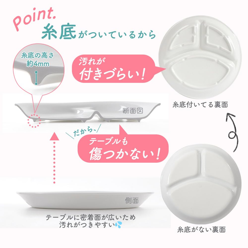 ワンプレートに便利な3つ仕切り皿です。糸底がついているのでテーブルにべったり付かず、汚れにくい、テーブルが傷つきにくいのがポイントです。糸底には切込みが10か所も入っているので水切れが良く乾きやすい、ママパパにも嬉しい子供食器です。