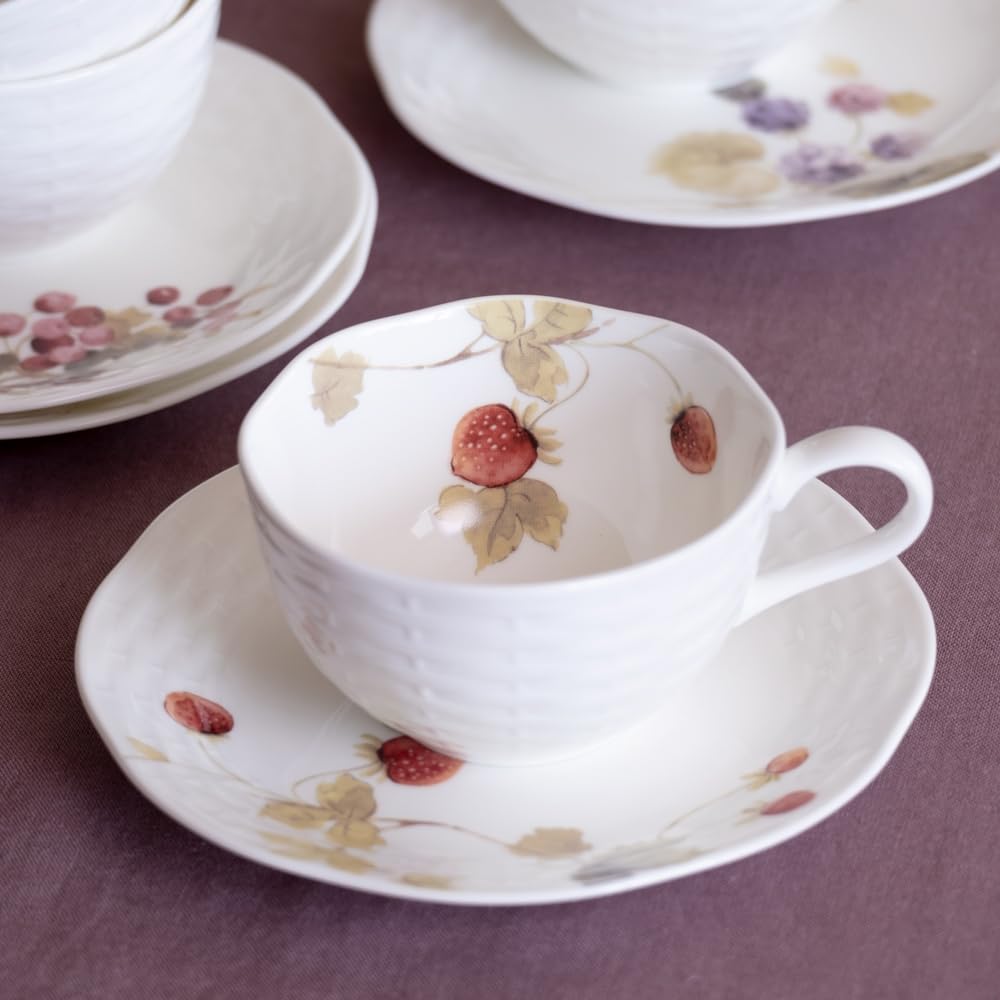 ルーシーガーデンシリーズの中でも特に人気の「ストロベリー」と「ブラックラズベリー」の絵柄をアソートにした、コーヒー紅茶どちらでもお使いいただけるカップ&ソーサーと同じ素材のスプーンのペアセットです。ソーサーは小皿として、カップはスープカップなどとして、季節や場面を問わず活躍します。