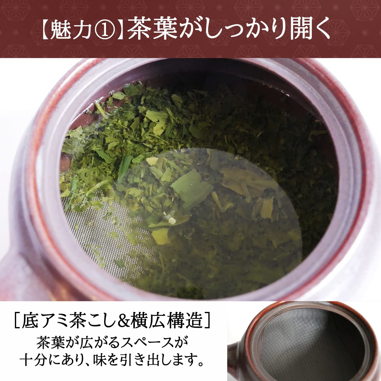 【底網茶こしの魅力】①二煎目も美味しくなる ②茶葉が広がりやすい ③比較的手軽なお値段になりやすい