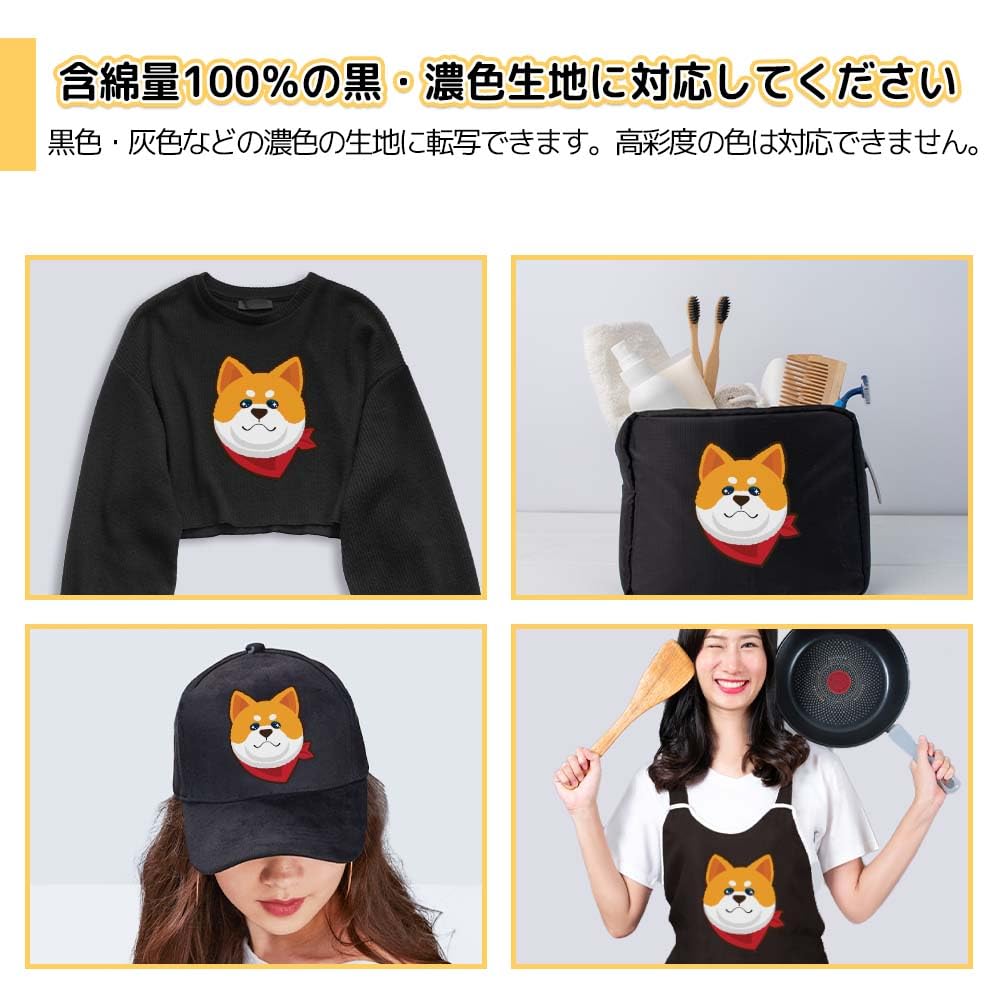 転写できる生地:純綿の黒・濃色生地&白色・薄色生地 *絵柄以外の部分は白色で布に転写されますので、絵柄のみを転写したい場合は、余白部分は切り取ってください。
