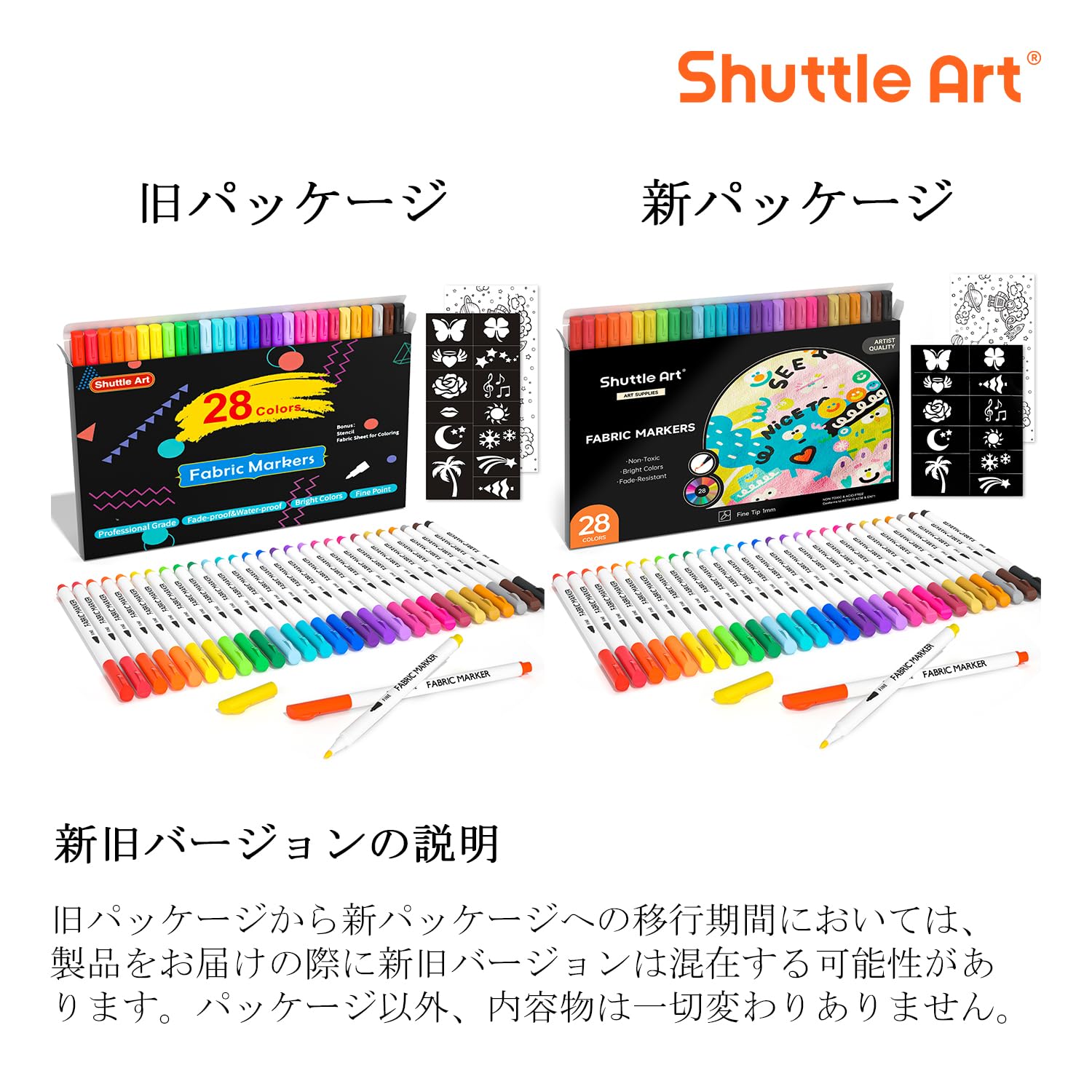 【在庫処分】Shuttle Art 布用 ペン 28色セット 布に書けるペン ファブリックマーカー 水性 耐水 耐久 ウォッシャブル 洗っても落ちない 色褪せしにくい 乾燥まで速い ステンシル付き DIY ハンドメイド 手作り イラスト 落書き スニーカー Tシャツ カンバス 子供