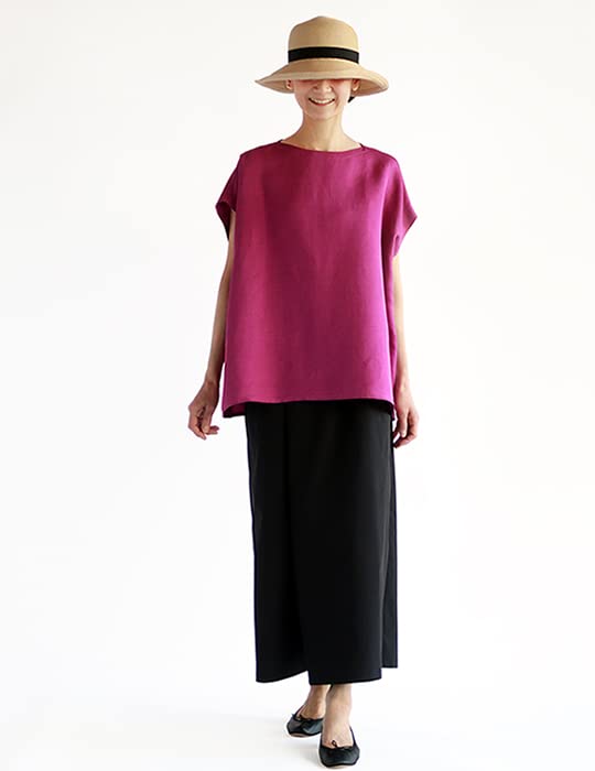 ワイドな肩幅のフレンチスリーブは、肩先がドロップして小さな袖になります。広い身幅で緩やかにフレアーが入り、ゆったりとしたTシャツのようなふんわりシルエットのブラウス。ボートネックは横に広く、浅めの衿ぐりのライン。後ろ釦ループあきで簡単な仕様のプルオーバータイプです。