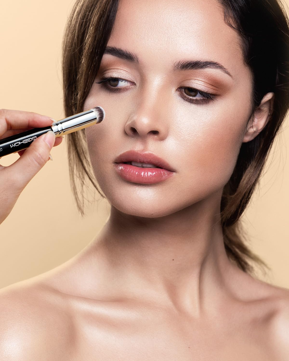 斜めの毛はブラシが非常に密度が高いため、液体コンシーラーに最適です。斜めの丸い毛が全体に均一にカバーします。まぶたにプライマーを塗るのにも使えます。毎回、素晴らしいカバー力と完璧なタッチアップを実現します。