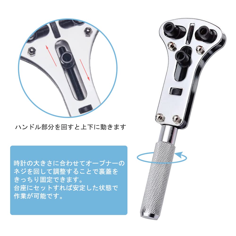時計の大きさに合わせてオープナーのネジを回して調整することで裏蓋をきっちり固定できます。