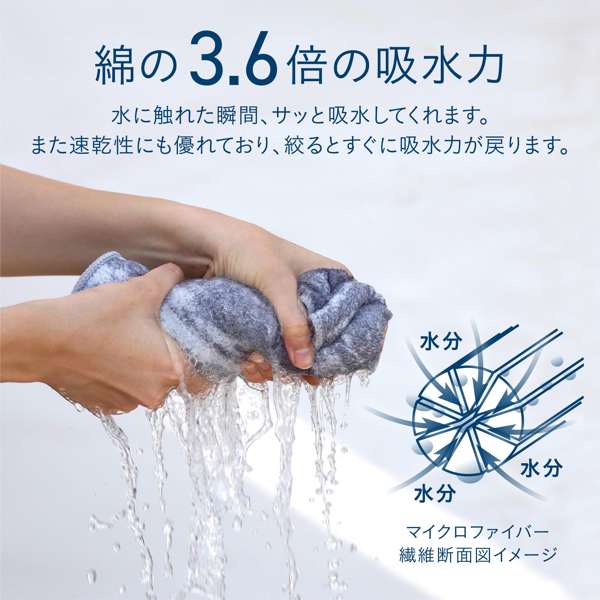 【綿の3.6倍の吸水力】水に触れた瞬間、サッと吸水してくれます。その吸水力はなんと綿のタオルの3.6倍!まるでタオルが肌に吸い付くように、水分をしっかり吸水してくれます。摩擦による肌や髪へのダメージ軽減にもなり、タオルドライの時短になります。