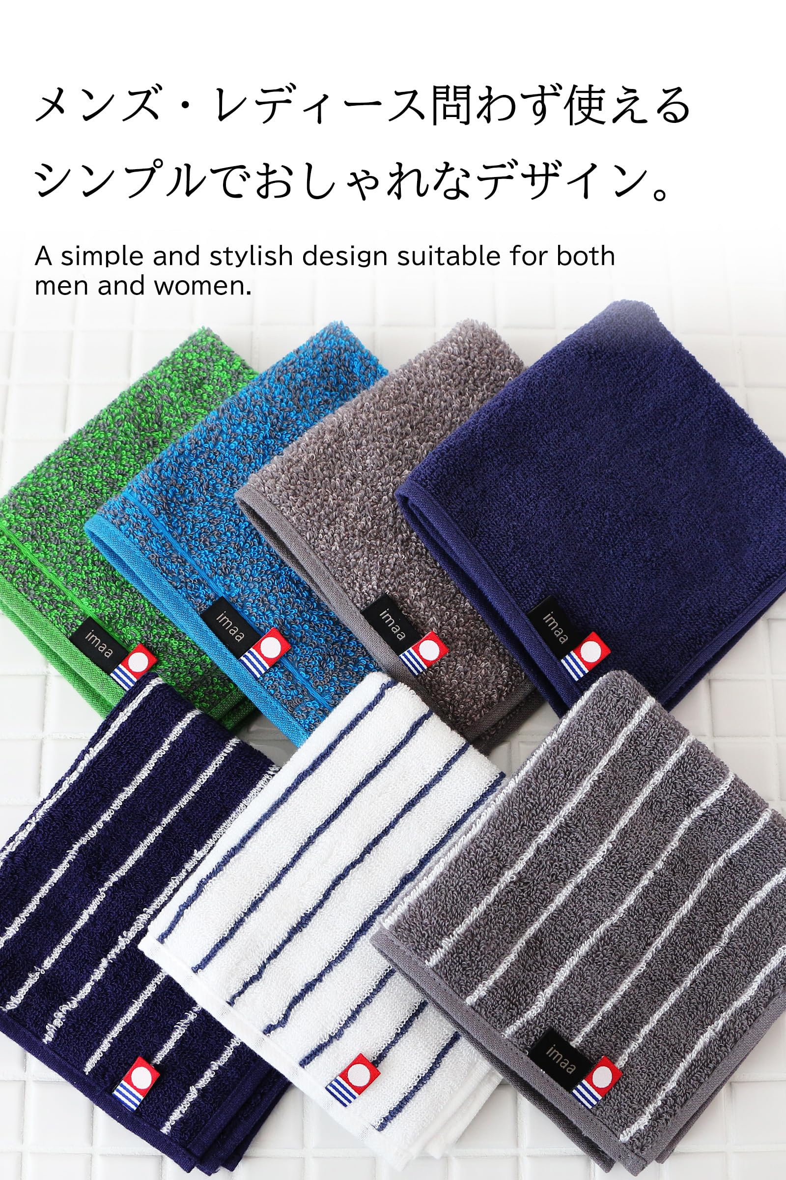 本商品は、当社オリジナルブランド「imaa」が企画・デザインした今治産のハンカチタオルです。 男女兼用で使えるシンプルで洗練されたデザイン。ピンストライプやミックスカラーを中心に、ビジネスシーンでもカジュアルでも使いやすいカラーリングを取り揃えました。
