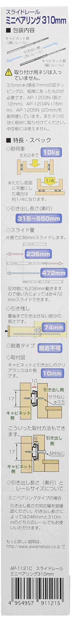 アイワ金属 アイワ スライドレール ミニベアリングタイプ 310mm 1セット入り AP-1121C
